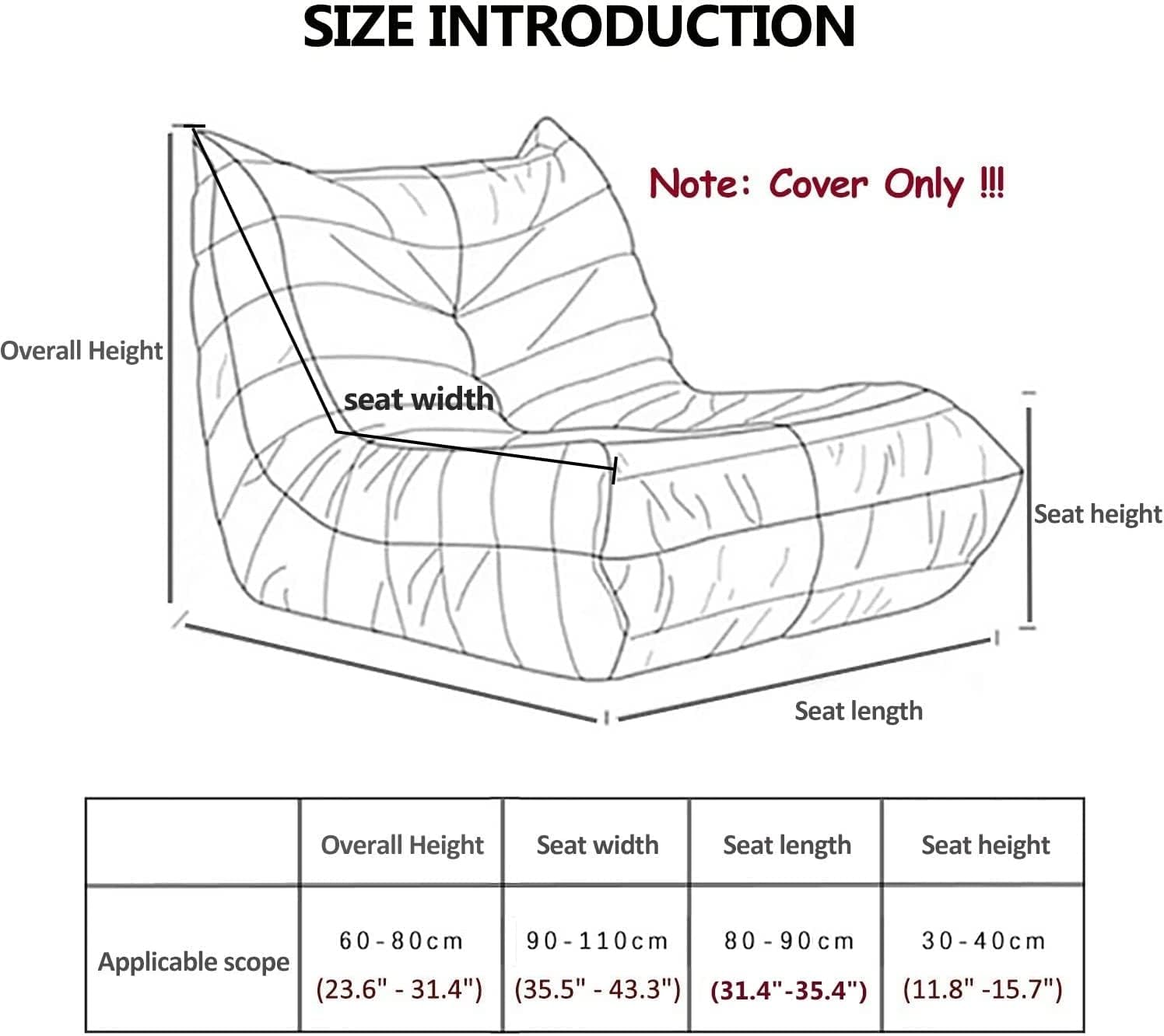 Fireside Chair Cover immediately improve the look and feel of your current sofa.Velvet fabric helps you achieve a fancy and elegant style, transforming your old couch into a modern piece within a few seconds.Solid color provided makes it easier to coordinate with your space decor. ✔Wrinkle-resistant. Unlike other slipcovers that require frequent ironing, our bean bag cover shrink Resistant means that it stays new.you can now keep your electricity bills low and no longer need time in ironing. ✔With Thick Elastic Bands. Upgraded new version lazy sofa cover use more deep elastic corners, which helps the slipcover stay in place. Plus, it’s easier to put on,as you just slip it over the cushion. ✔Perfect Fit,All-Round Protection. Thicker fabric great for households with kids and or pet as it offers ample protection against wear and tear. Allows you to read your latest book, meditate comfortably on the floor or play board games with your family! Great for adding extra seating when friends and family come over to watch the game! Perfect for kids playing games,reading, coloring, or playing. ✔One-size-fits-most: Easy to Install and Features Instructional Tags to Help with the Installation Process.(However, it is advisable for you to measure the size of your sofa before placing an order). -Overall Height:23.6"-31.4"/60-80CM. -Seat Width:35.5"-43.3" /90-100cm. -Seat length:31.4"-35.4" /80-90cm. -Seat height:11.8"-15.7" /30-40cm.