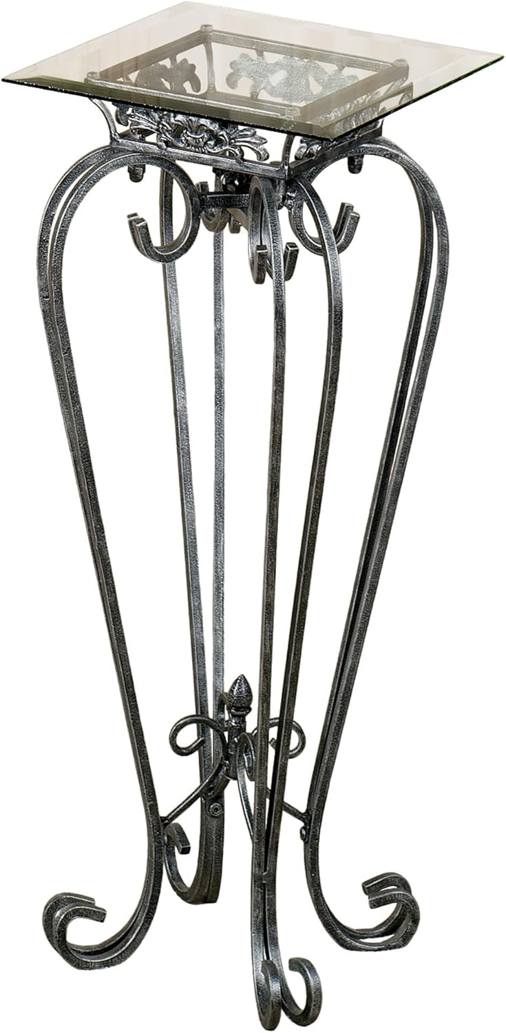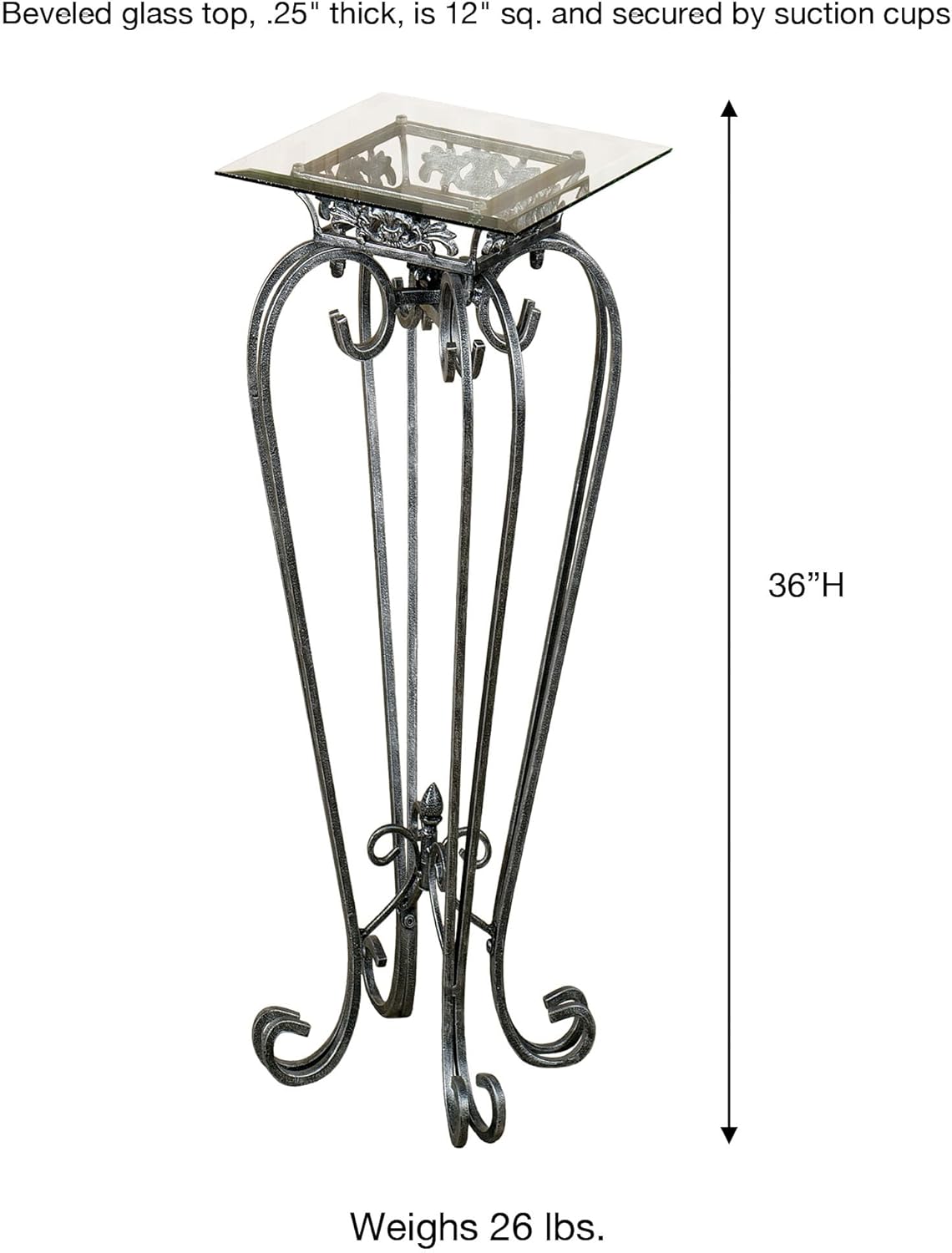 The durable iron and glass Chalcedony Scroll Pedestal Tables feature airy scrolls with acanthus leaf and fleur-de-lis accents. Beveled glass top, .25" thick, is secured by suction cups. Each pedestal table has hand-rubbed gold highlights. Select from two heights, or purchase both sizes for a stepped display. Glass top is 12.5" sq. Medium, 23 lbs. Large, 26 lbs. Full assembly required. The Chalcedony Scroll Pedestal Tables are made from iron and glass. Dust with a soft, dry cloth. This item is our exclusive! Choose Antique Gold or Antique Pewter Specify Medium (30"H) or Large (36"H)