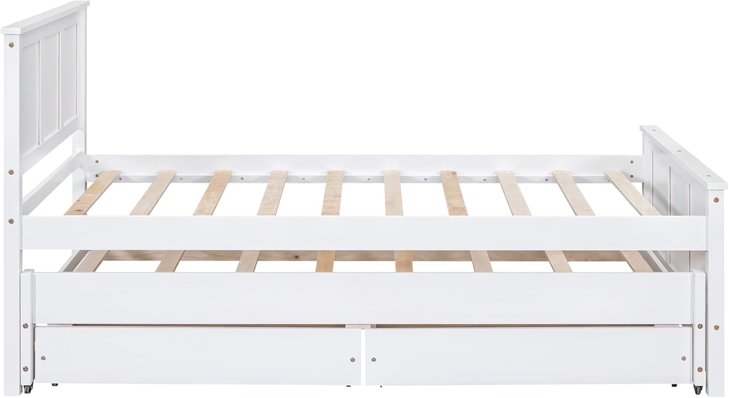 Bellemave Wood Twin Size Platform Bed with Trundle and Drawers This twin size captain beds offers a variety of features to meet your various needs. The twin bed comes with two drawers with rollers, which are very convenient to use and offer excellent storage for your belongings or bedding. There is a trundle under the bed, perfect for an overnight stay or friends, perfect for a bedroom or guest room. With its minimalist lines and appearance, this wood platform bed adds a touch of rustic style to your room, elegant and suitable for any room style. Made of solid pine wood and high-quality MDF, the bed provides strong support and will serve your family for many years. Description Bed Material: Pine wood+MDF Size: Twin Color: White/Gray Numbers of Package: 1 Assembly Required: Yes Dimensions Overall Product Dimension: 80''L*97.6''W*41.3''H(with trundle and drawer out) Bed Dimension: 76''x39.3'' Trundle Dimension: 75.5''x39.2'' Total Height: 41.3” Number of Daybed/Trundle Slats: 10/8pcs Overall Product Weight: 102.5 lb Daybed/Trundle Capability: 300 lbs Recommend Daybed Mattress Thickness: 6-8”