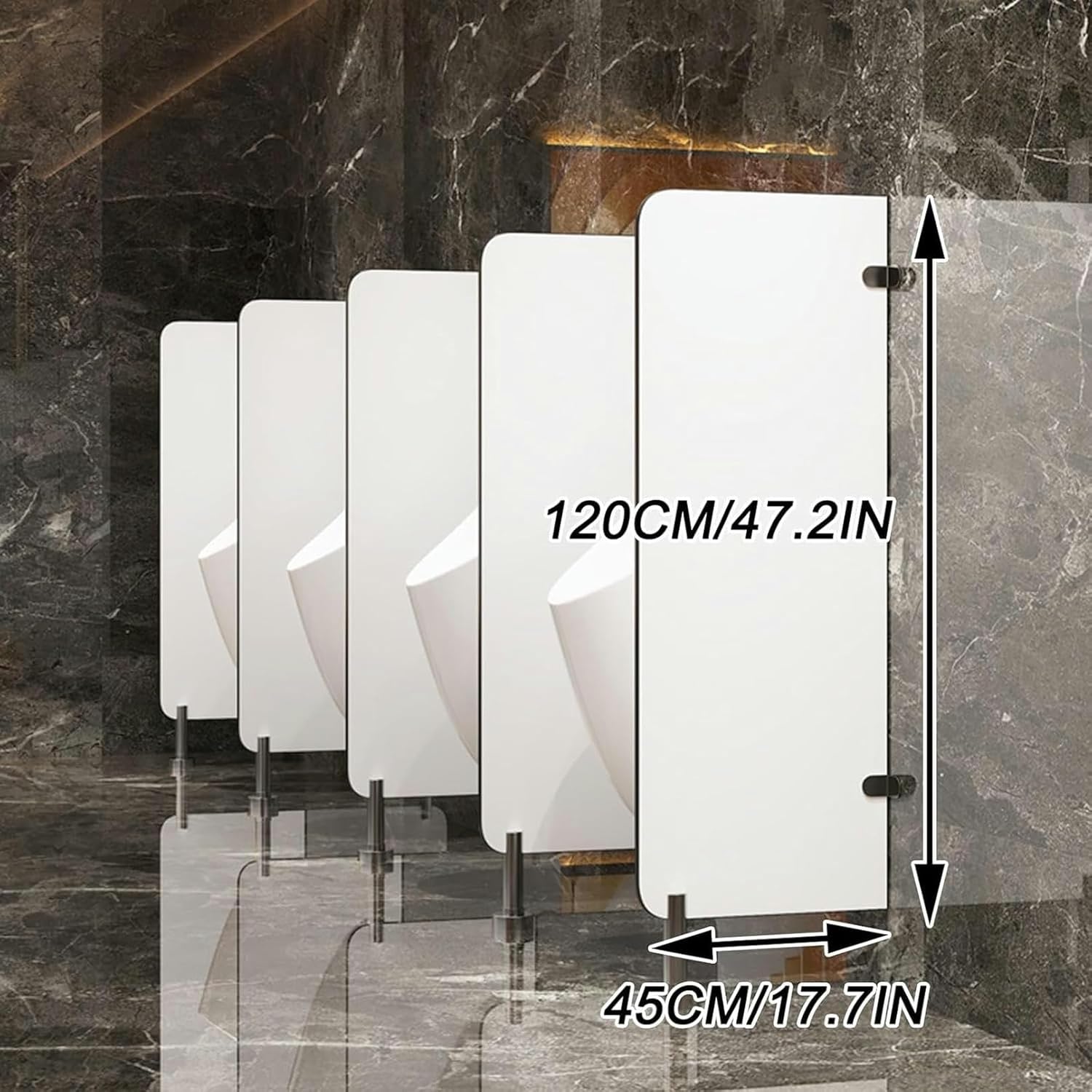 ➤ Urinal Privacy Screen Divider Partition, Hotel School Office Public Restroom Toilet Partition Board.➤ Feature:* A 120cm high room divider wall will provide extra privacy to block some visual clutter and make the space more uncluttered.* The elegant design can also help you decorate your room while creating privacy, it is the best partition for public toilets.* Our urinal partition is designed with ease of installation and maintenance.➤ Product Parameters:- Name: Urinal Partition/Restroom Partitions/Urinal Privacy Screen- Material: Anti-fold special board- Size: Height 120cm x Width 45cm- Installation type: Floor-standing- Suitable places: Public toilets, bars, hotels, shopping malls, studios, garages, restaurants, schools, etc.- Packing list: Toilet partition x1/Toilet partition x2/Toilet partition x3/Toilet partition x4➤ Note:1. The above size parameters are measured manually, there will be an error of about 1-2 cm, thank you for your understanding.2. There may be slight color differences due to the display, camera, and other factors, so please refer to the actual product.3. If you have any questions, please feel free to contact us. We will reply to you within 24 hours and provide the best service.