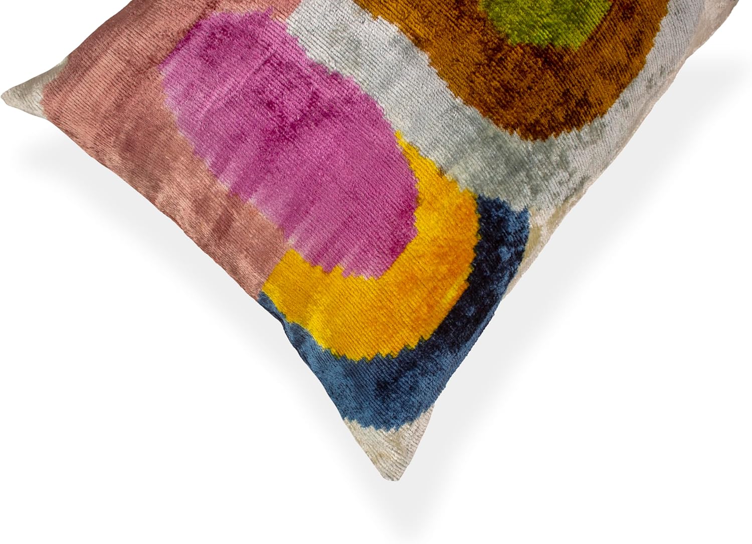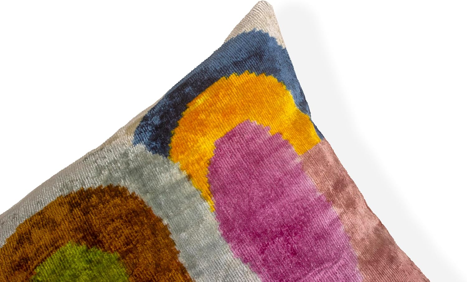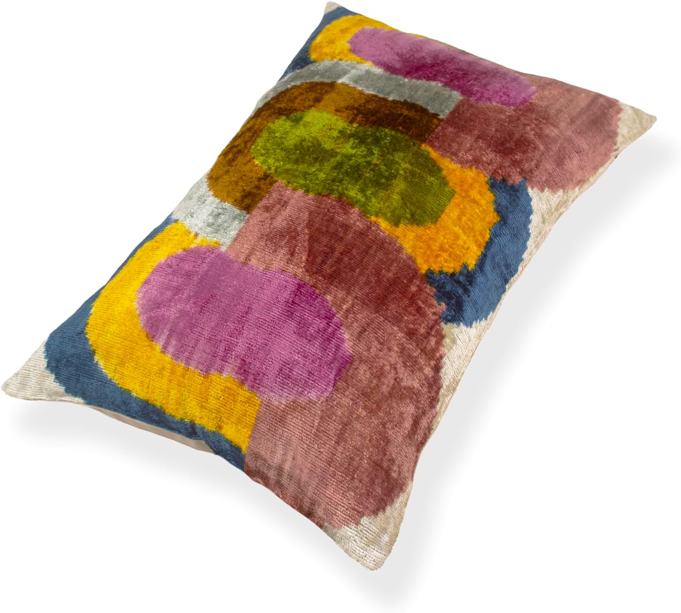 MODERN MULTICOLOR VELVET IKAT PILLOW: Our Ikat pillows are made from genuine Ikat fabrics, not prints. The patterns on our products are formed during the weaving process, not printed. They are produced with a technique very similar to traditional rug weaving. The production process of Ikat fabrics is highly labor-intensive; it takes an average of 3 months to produce 100 yards of fabric. Depending on the loom, our fabrics are woven in widths of 42 cm (17 inches) and 62 cm (25 inches). For pillows wider than 16 inches, we create larger sizes by sewing the fabrics and patterns side by side. The stitches are completely hidden and invisible. You can order our products in 9 different sizes and with 16 different back side color options. We also offer returns or exchanges if there is any issue with our products.
