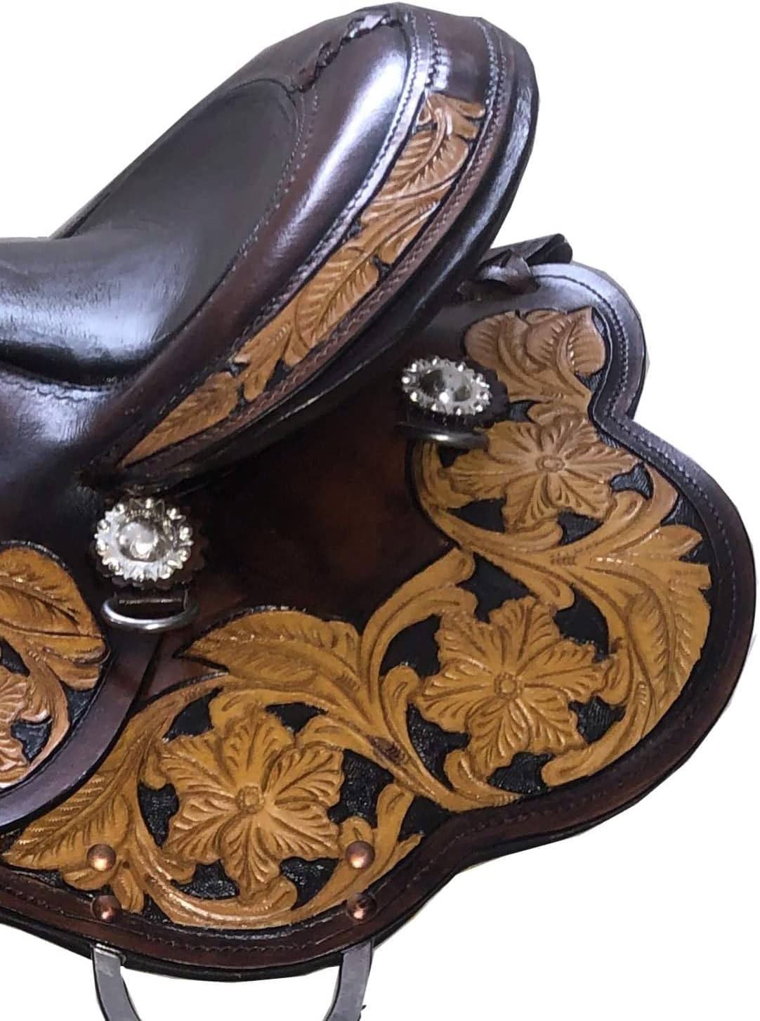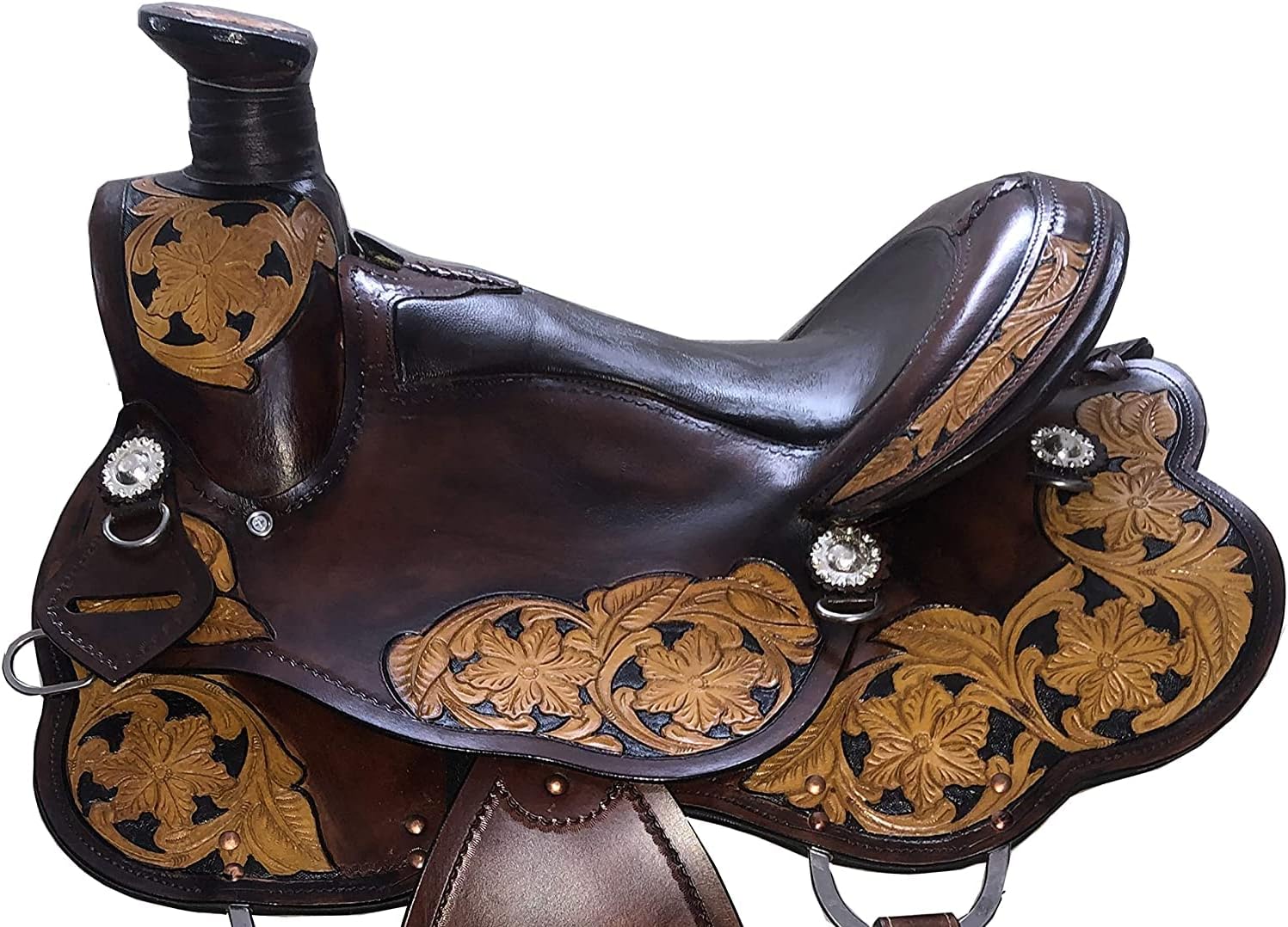 A saddle is an essential piece of equipment for horseback riding, providing both comfort and control for the rider. Crafted from high-quality materials like leather or synthetic fabrics, a well-designed saddle distributes the rider's weight evenly across the horse's back, preventing discomfort or injury. With its sturdy tree and padded panels, a saddle offers secure seating and leg positioning for optimal balance and communication with the horse. Whether you're a recreational ride Saddles are an essential piece of equipment for any equestrian, providing the crucial connection between rider and horse. Crafted with care and precision, a high-quality saddle offers comfort, support, and control for both the rider and the animal. Whether you're a seasoned competitor or a casual trail rider, finding the right saddle can make all the difference in your riding experience. With a wide range of styles and materials available, from classic English to rugged Western designs, there's a saddle to suit every discipline and preference. Invest in a well-made saddle, and you'll enjoy countless hours of enjoyable and secure riding adventures. *** Girth Cinch, Back Cinch, Saddle Pad, and Horse Bit NOT INCLUDED *** Our top selling leather colors are now available in this beautiful A-Fork wade tree roper! This wade tree roping saddle features a hand carved tooling that is designed on thick cowhide leather. The seat offers the perfect grip while roping cattle. The classic design of the saddle features shiny silver conchs and numerous ties for accessory attachments. . The wide pie horn is reinforced with a mule hide wrapping for extra stability and durability. The underside of the saddle is well-padded with fleece for maximum horse comfort. 100% Heavy Duty Cowhide Leather Hand Carved Tooling Seat Mule Hide Wrapped Horn Numerous Accessory Ties Shiny Silver Sun Conchs Adjustable Stirrups Adjustable Blevins Buckles Well-Padded Fleece Underside Wade Tree Design Wood Base Tree Wrapped In Fiberglass. If You require Wooden Tree Saddle in the same Model Kindly Drop a message. Saddle Specifications:- Color: As Per Picture. Pony Saddle Measurements:- Seat Size: 10 to 12 inches. Gullet: 5" FQHB . Skirt: 23 – 26” Horn: 2” x 5” wide. Horn: According to Picture. Swell: 6” Cantle: 3” Stirrups: 25 – 35 Weight: Approx. 24 lbs. Adult Saddle Measurements:- Seat: 14" to 18" inches Seat. Gullet: 7" FQHB . Skirt: 25 – 29” . Horn: 3” x 5” wide . Horn: According to Picture. Swell: 8” . Cantle: 4”. Stirrups: 28 – 38”. Weight: Approx. 28 lbs