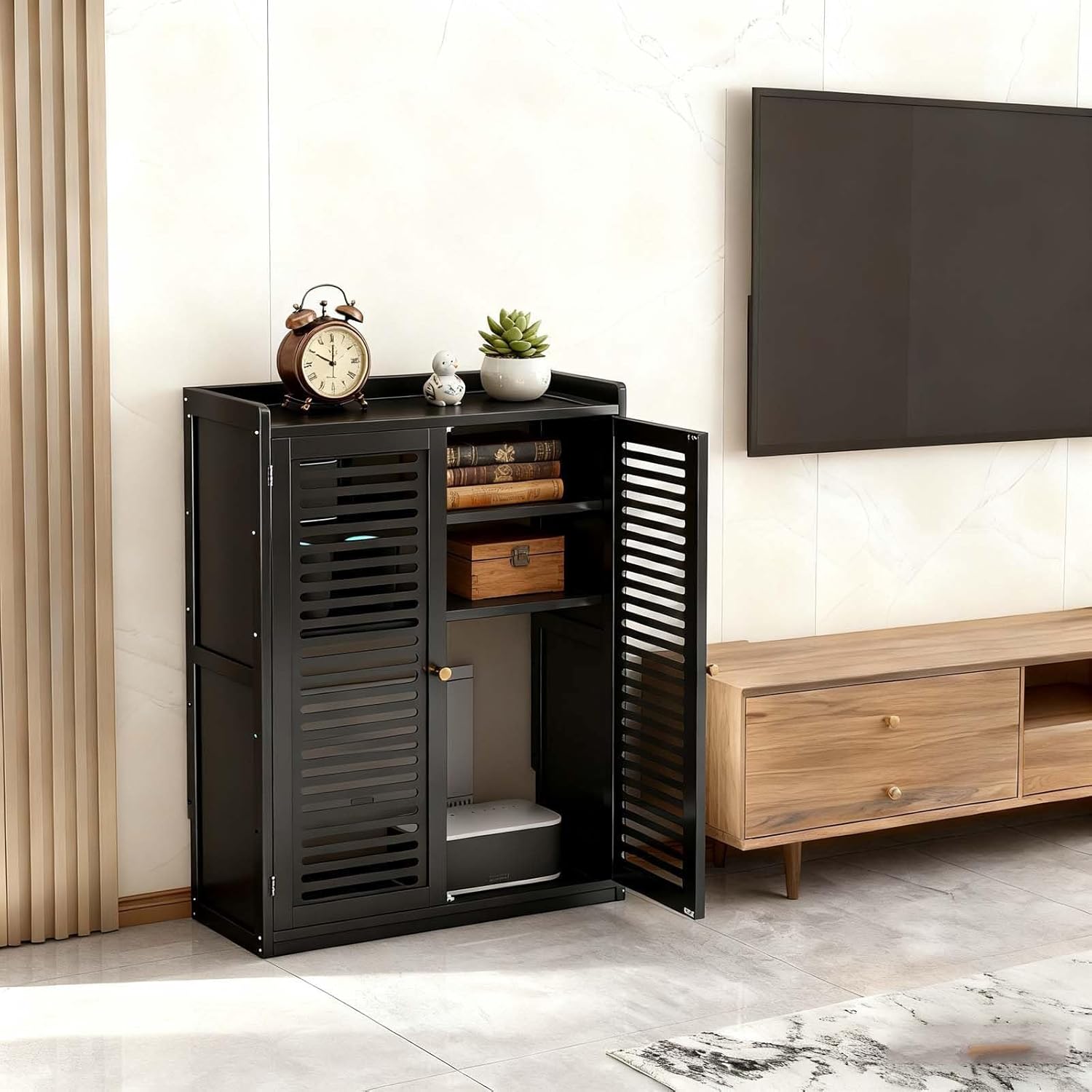 Introducing our stylish router box hider, designed to seamlessly conceal your routers and modems while ensuring optimal signal strength. This innovative device features carefully crafted hollowed-out ventilated panels that allow for efficient airflow, preventing overheating and maintaining reliable performance. Ideal for modern families, this router organizer fits perfectly in living rooms or home offices, enhancing your space's aesthetics without compromising connectivity. The sleek design not only keeps your devices out of sight but also helps declutter your environment, creating a more organized and inviting atmosphere. Using the router box hider is a breeze—simply place your routers and modems inside, tidy up the cables, and close the magnetic door for a clean look. Made from high-quality bamboo and MDF, this product is not only stylish but also durable and resistant to dust and moisture, making it easy to maintain. A quick wipe with a damp cloth is all it takes to keep it looking fresh. Available in elegant colors—White, Black, and Tea—this versatile wifi router storage box complements any decor style, whether contemporary or traditional. Enhance your home organization while enjoying uninterrupted internet access with our router box hider, the perfect blend of functionality and design.