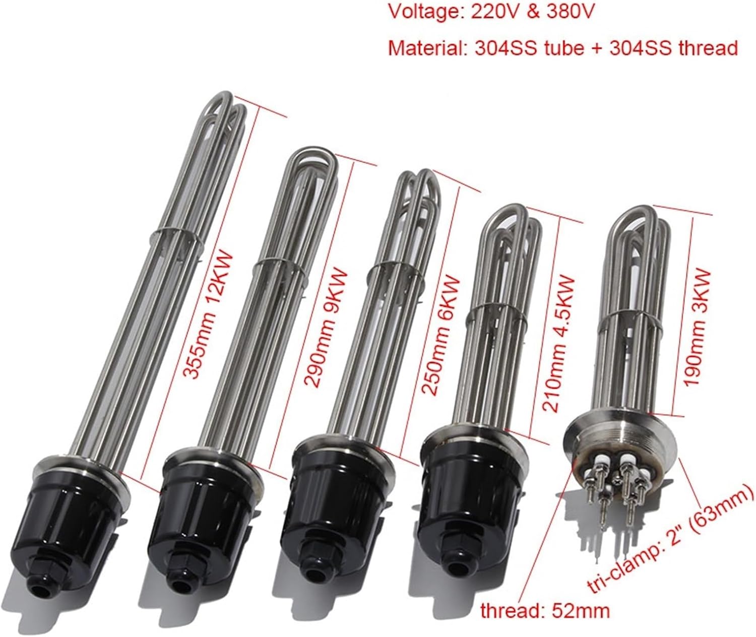 All 304SS 2"tri Electric Heater Heating Element 3KW/4.5KW/6KW/9KW/12KW 220V380V for Homebrew with clamp & CouplingProduct Name Heating ElementTube Length 195mm230mm/250mm/295mm/350mmVoltage: 220V/380VPower: 3KW/4.5KW/6KW/9KW/12KWTube Diameter: 8mmThread Diameter: 52mmFlange Disc: 63mm (2inch Tri-clamp)Tube Material: 304 stainless steelThread Material: 304 stainless steelWith ground screw: YESTo dear all,1. Heaters are industrial products, not vase. some may have flaws, such as weld, such as stainless steel trace and polish trace. that's normal.2. Because the heating wire inside the heater tube is made of OCr25A15 which is Magnetic, it is normal that the element can be adsorbed by magnet.3. Under the condition of insulation, the international standard for the heater power accept allowance -10% to 5%.If you are care about these, please think twice before make order. Thank you for your attention.==========Model Number : 2"Tri-clamp(OD63)Type : Electric Water Heater PartsOrigin : Mainland Tube Length : 195mm/230mm/250mm/295mm/350mmTube Diameter : 8mmThread Diameter : 52mmVoltage Power : 220V/380VTube + thread Material : 304 Stainless SteelPower : 3KW/4.5KW/6KW/9KW/12KWFlange Disc : 63mm (2inch Tri-clamp)Application : for Heat-conducting oil stove,water tank, boiler, reaction kettleFunction : For heater water/oil