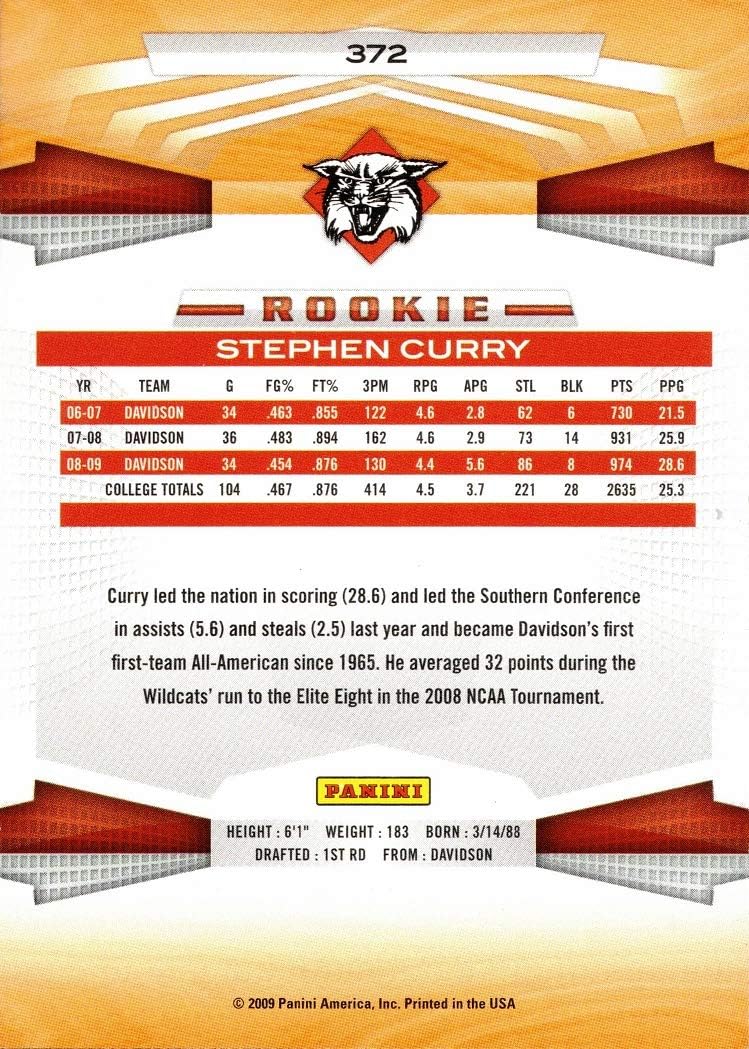 2009-10 Panini Basketball #372 Stephen (Steph) Curry Rookie Card - Davidson. This is an original, authentic Steph Curry Rookie Card produced by Panini in 2009. Card is in Near Mint to Mint condition. Stock photo shown.