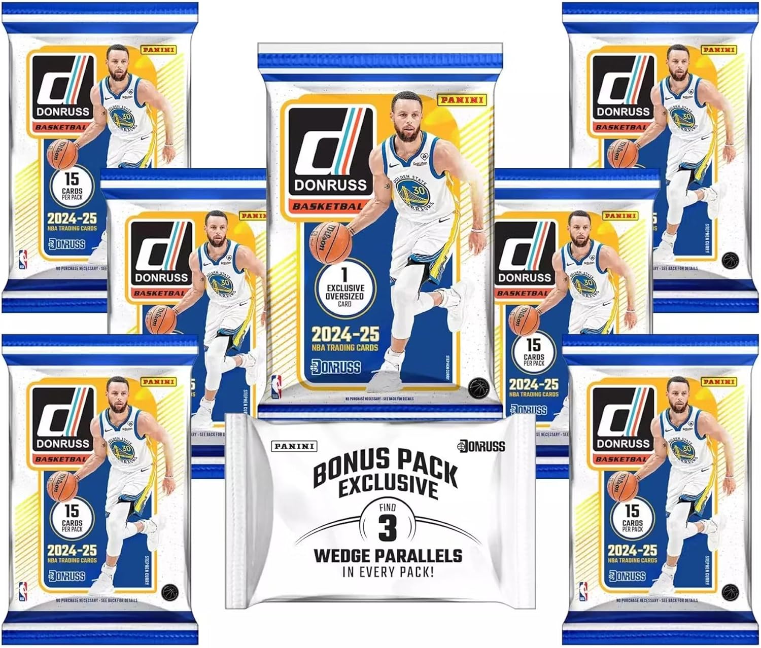 Included: 6 Bulk Packs, 15 Cards per pack, 1 Bonus Pack (3 exclusive wedge parallels), 1 Oversized Box topper 2024/25 Panini Donruss Basketball Bundle BoxEach Box contains Three Wedge Parallels, on average!Find One Oversized Box Topper!Donruss makes its return for the 2024-25 NBA Season! Collect the iconic Rated Rookies this year, which includes 50 of the top newcomers!Search for Retail-Exclusive inserts in sets such as Great X-Pectations, Magicians, The Rookies, Franchise Features, Bomb Squad and all new this year, Pass the Rock! Also search for Retail-Exclusive SSP's Fadeaway and Playmakers!