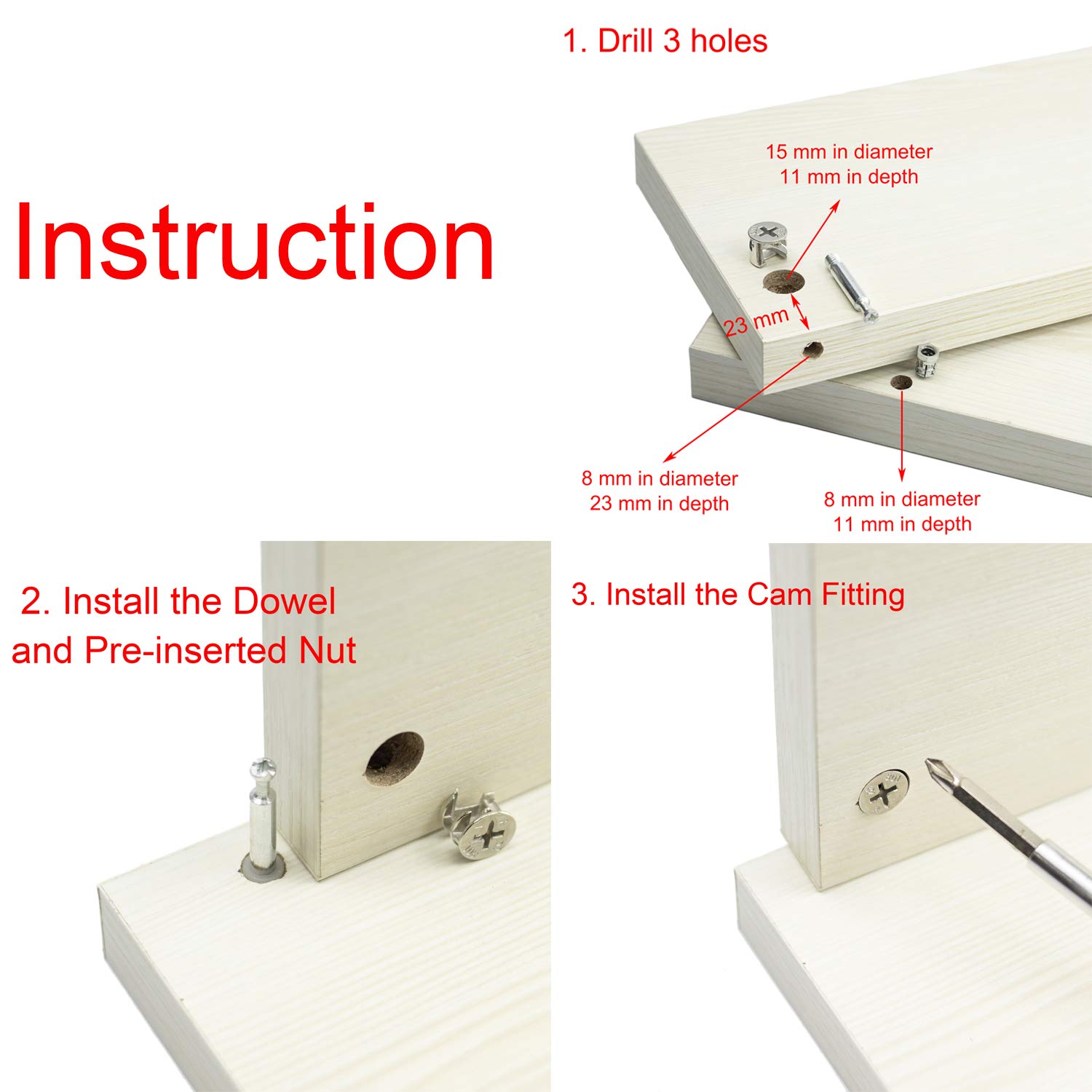 Specifications:Cam Fitting Size: 15 mm in diameter and 11 mm in height. Made of high quality zinc. Dowel Size: 7 mm in diameter and 40 mm in length. Made of premium stainless steel. Pre-Inserted Nut Size: 8 mm in diameter and 11 mm in height. Made of premium stainless steel. Suitable for panel connection of panel furniture, office furniture, cabinets, wardrobes and morePackage contents:30 x Cam Fittings30 x Dowels30 x Pre-Inserted NutsPlease don't hesitate to contact us for help if you have any issue, we will always give you a solution within 12 hours.