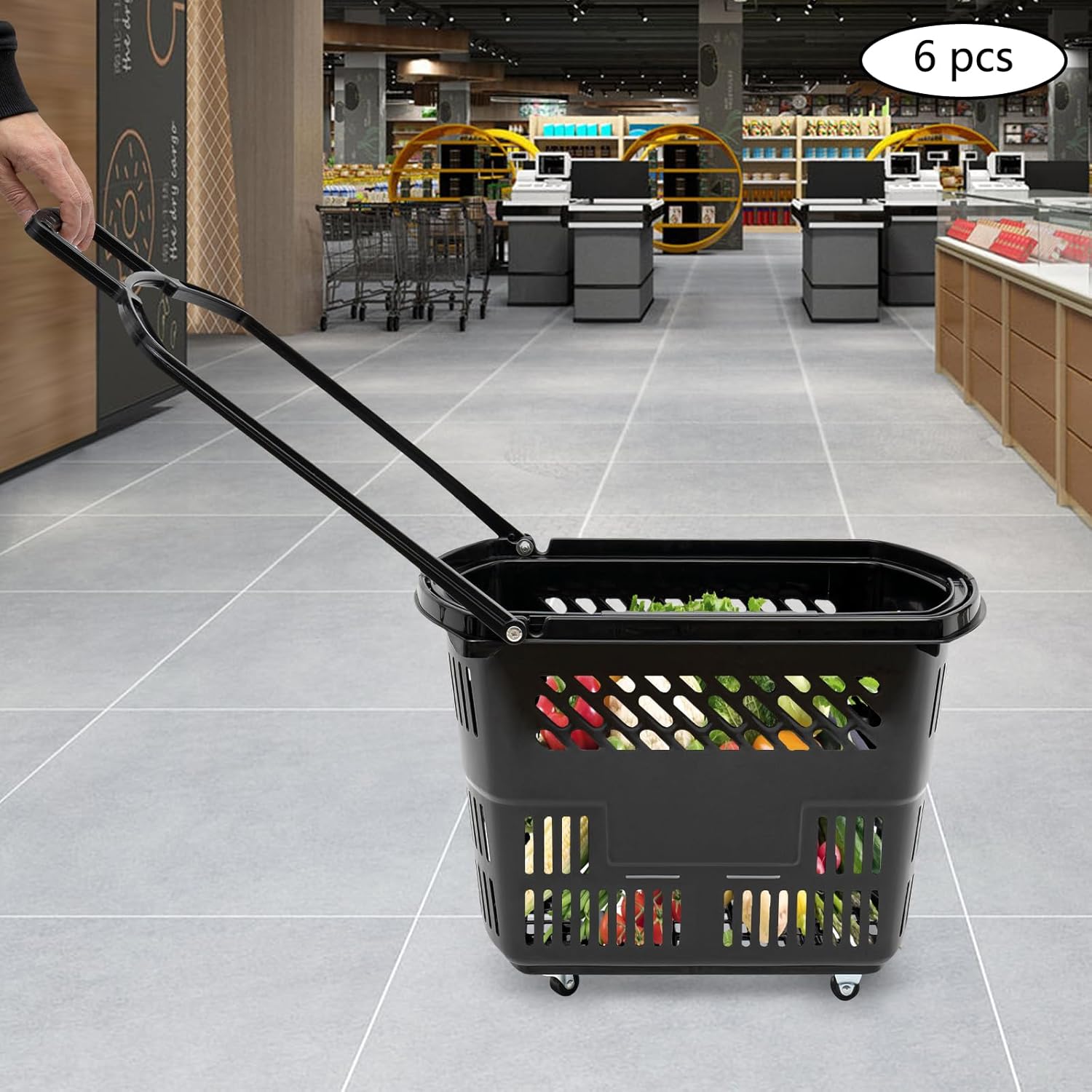 DescriptionHave you ever struggled with heavy goods? This rolling shopping basket will bring a convenient shopping trip for you. Made of high-quality PP, it has good durability and stability. Meanwhile, the four wheels on the bottom make it easy for you to move this product. It will a good addition to the warehouse, department store, classroom, supermarkets, factory, etc. Key FeaturesA Set of Six: It includes a total of 6 baskets in the package, which can meet the needs of small supermarkets and is cost-effective and economical. Ready to Use: This product doesn't need assembly and can be used directly after receiving it, saving you lots of time and effort. Easy to Clean: The surface of this product is smooth, flat, and easy to clean. You just need to rinse it with water. Guaranteed Customer Service: We aim to provide quality products and services. If you have problems, please feel free to contact us. We will reply and solve the problem for you as soon as possible.DetailsErgonomic Handle: It is equipped with two ergonomic handles to pull or lift, allowing you to easily carry items. Its long handle (21inch) is particularly suitable for the elderly, people with back problems, pregnant women, etc.Grid: The basket adopts a grid design to promote good water drainage and ventilation to prevent bacterial growth and odor. ApplicationIt is suitable for carrying and storing clothing, groceries, camping tools, gardening tools, office documents, luggage, bottled water, sports equipment, and beach equipment in bookstores, supermarkets, KTVs, and other places.SpecificationModel: MX-8Color: BlackMaterial: PPStyle: ModernCapacity: 35L/9.2galNumber of Pieces: 6Number of Wheels On Each Basket: 4Wheel Type: 2 Universal Wheels, 2 Directional WheelsEach Product Load-bearing Capacity: 50kg/110lbsMounting Type: FreestandingNet Weight: 8kg/17.64lbsGross Weight: 9.5kg/20.94lbsPackage Size: 60*60*36cm/23.62*23.62*14.17inchEach Basket Size (Without Handle): 50*35*36cm/19.69*13.7*14inchHandle Length: 53cm/21inch Package Included6* Rolling Shopping BasketsNotesPlease allow the slight color difference caused by the shooting light and 1-3cm error due to manual measurement, and make sure you do not mind before ordering.