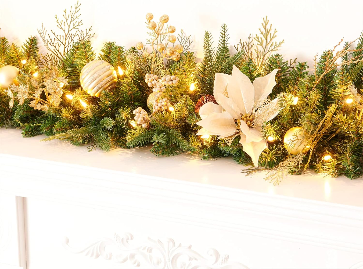 AMERZEST 9FT Prelit Artificial Christmas Garland with Dual Color LED Lights and Timer by Remote Control and Batteries Operated for Mantle Stairs Fireplace Door Xmas Decoration, Indoor Outdoor, Green