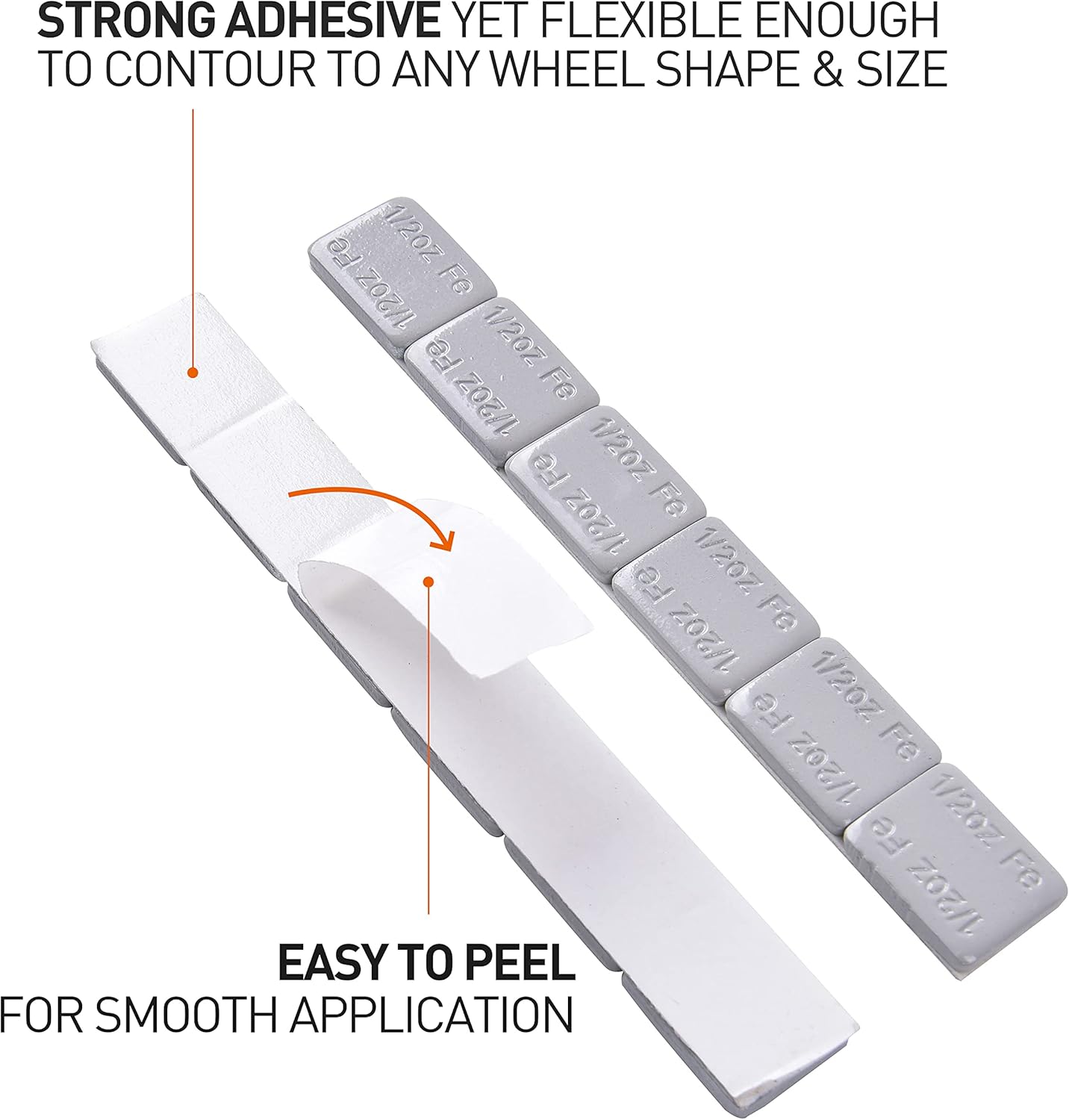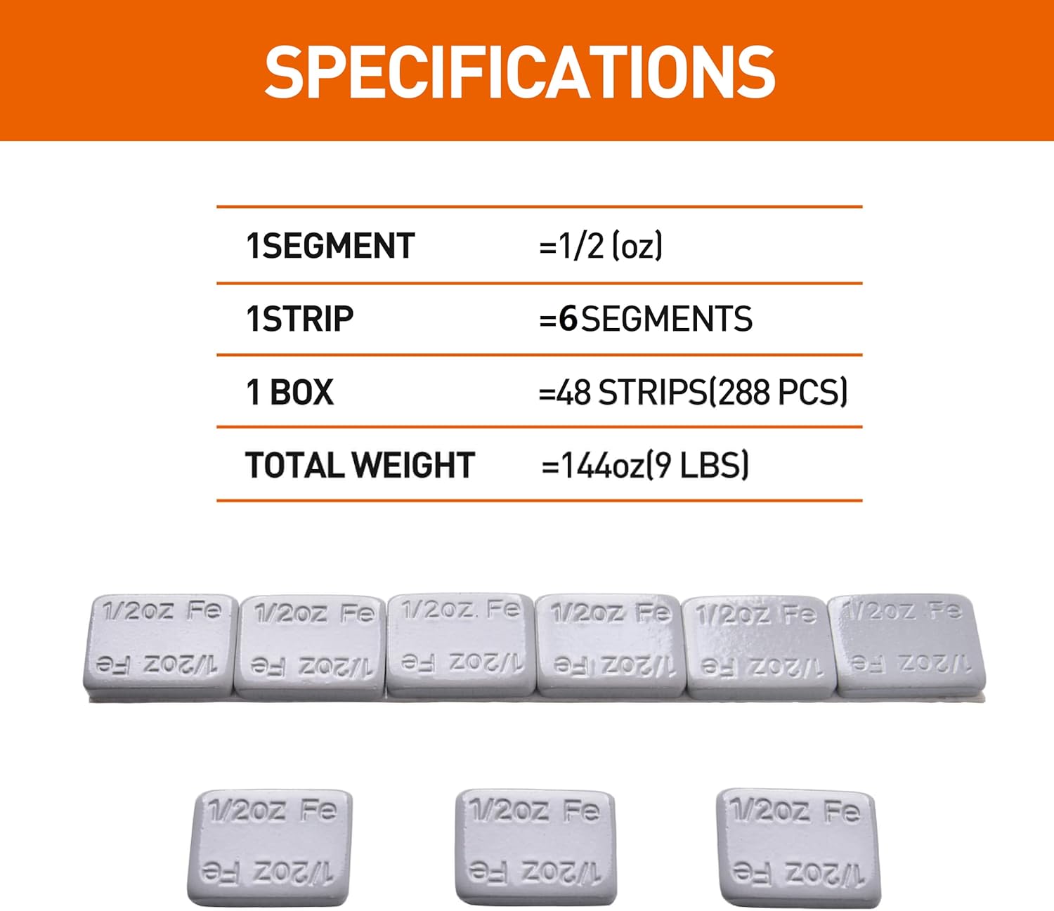 Wheel Weights: Low Profile, Grey, US standard, high quality guaranteed for a safe tire system and safe driving. Specifications: 288pcs, 1/2 oz. Segments. 6 Segments per strip. 48 Strips per box. Single Box Weight 144 oz. (9 lbs.). Made in the USA Easy Peel Paper Backing for easy installation. Segmented weights allow for easy contouring to wheel. 0.5oz. weight and 4 mm thick segments on an easy to peel strip allows you to select the precise weight required. Use for a variety of applications that require a small adhesive weight. They work great for radio controlled race cars when you need to meet the minimum weight requirements or to change the balance of the car.