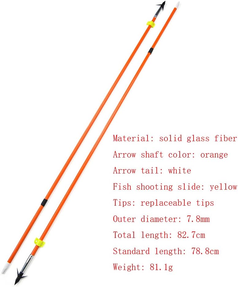 Green arrow: Arrow shaft color: black Arrow tail: transparent green insert tail Arrow weight: 41.3g Arrow: 100 grains (removeable) Material: fiberglass Fish shooting slide: yellow Standard length: 77.5cm Total length: 80.2cm Outer diameter 8mm Inner diameter 6mm Orange arrow: Arrow shaft color: orange Arrow tail: white Fish shooting slide: yellow Arrows: replaceable arrows Outer diameter: 7.8mm Total length: 82.7cm Standard length: 78.8cm Material: solid glass fiber Weight: 81.1g Bow fishing reel: material: metal Seat length: 12.5 cm / 4.92”. Screw length: 5cm / 1.97". Weight: 153g Package include: 6 pcs bow fishing arrow + 1 x bowfishing reel 12 pcs bow fishing arrow + 1 x bowfishing reel