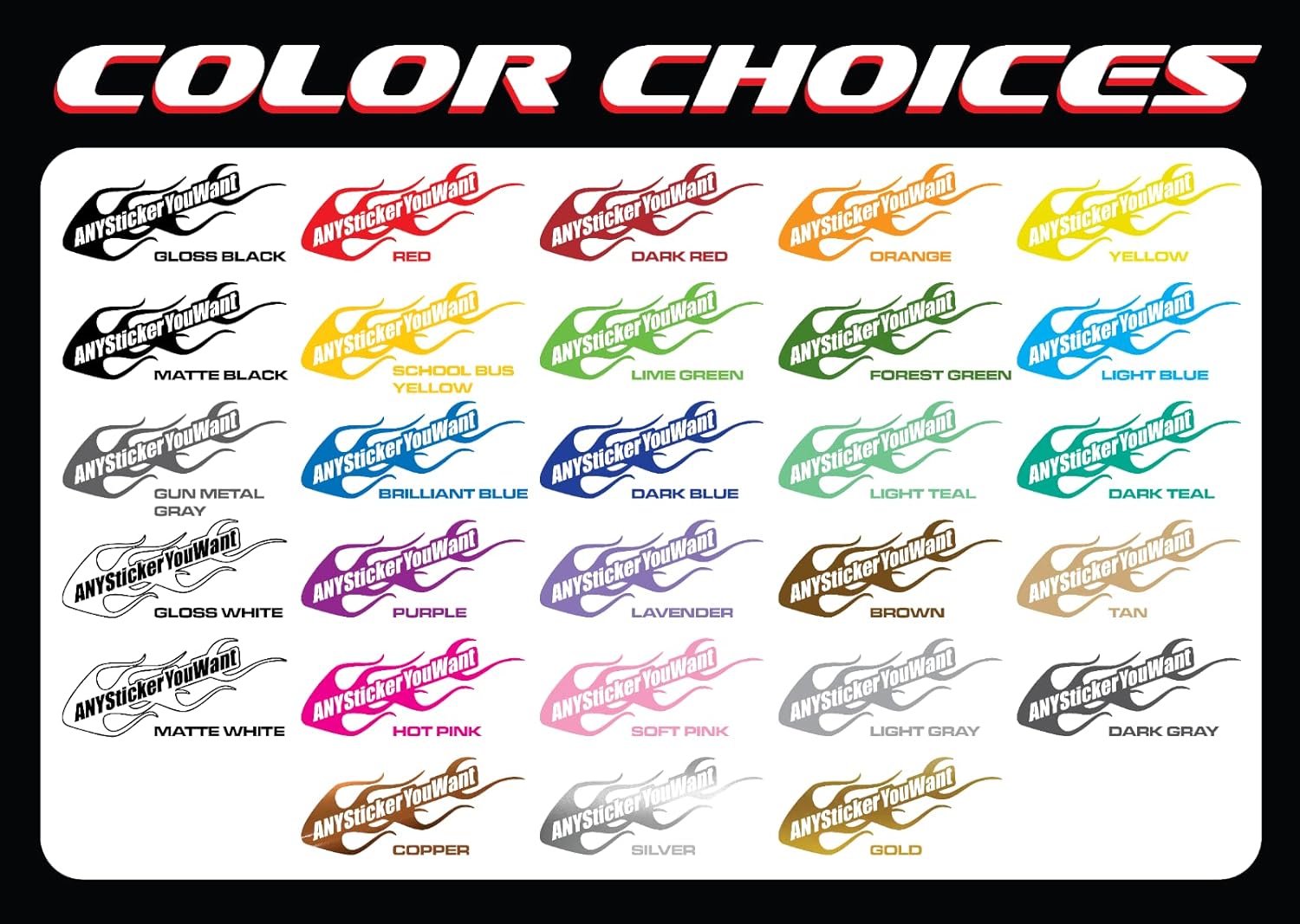 We only use high quality vinyl, made to last for years without fading or peeling and is car wash safe, just like the current stripes you may have on your vehicle. You may choose any color you want from our color chart. If you do not see the vent decal you are really wanting, look at our other listings for a "custom vent decal". You can have us design you a custom vent, exactly as you want. You can even upload an image for us to use if you like. As our brand name suggests, we can do ANY decal you want!