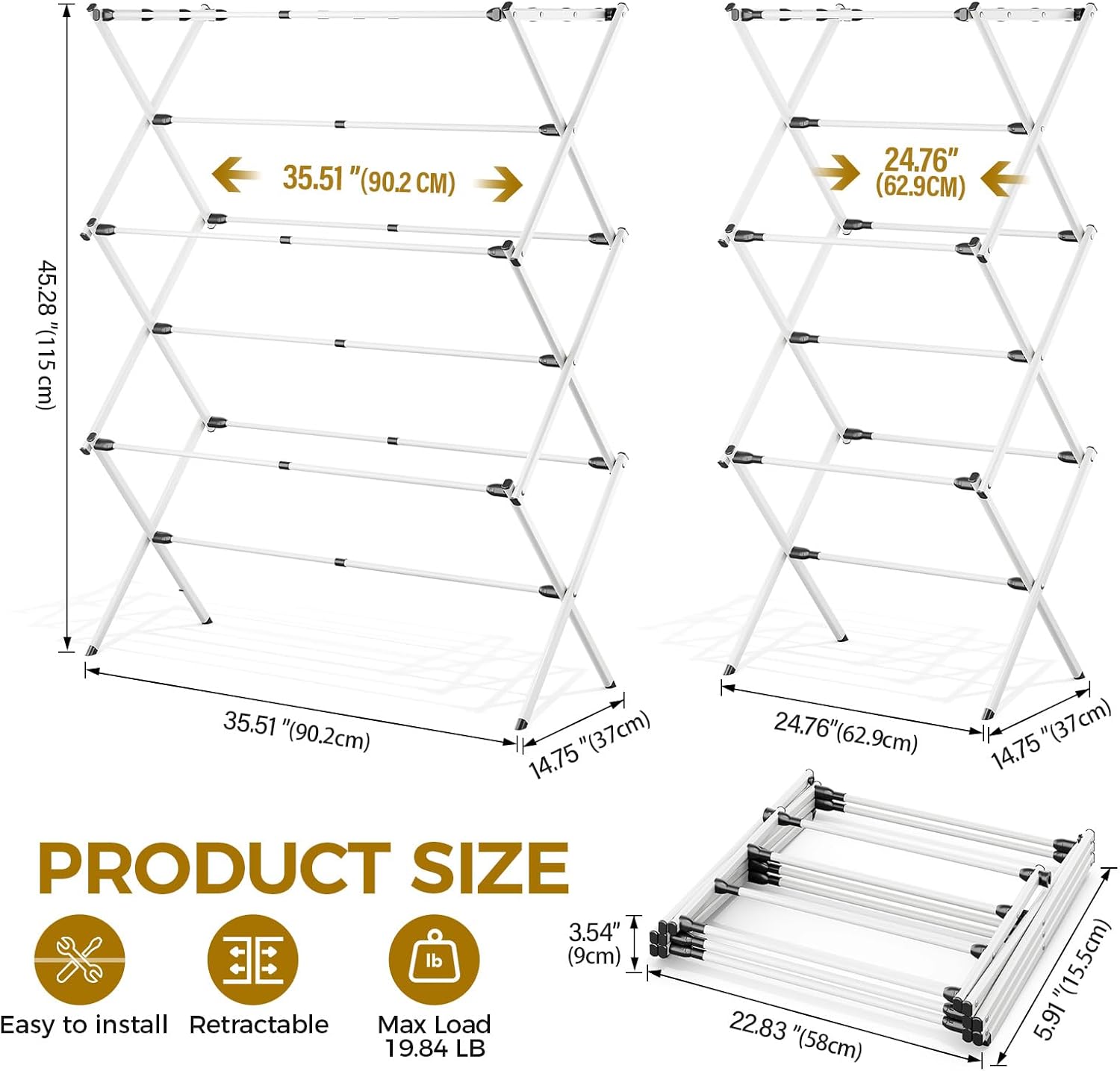 • The size is enlarged to increase the drying area. When fully unfolded, the dimensions can reach: 45.28" × 14.57" × 35.51"