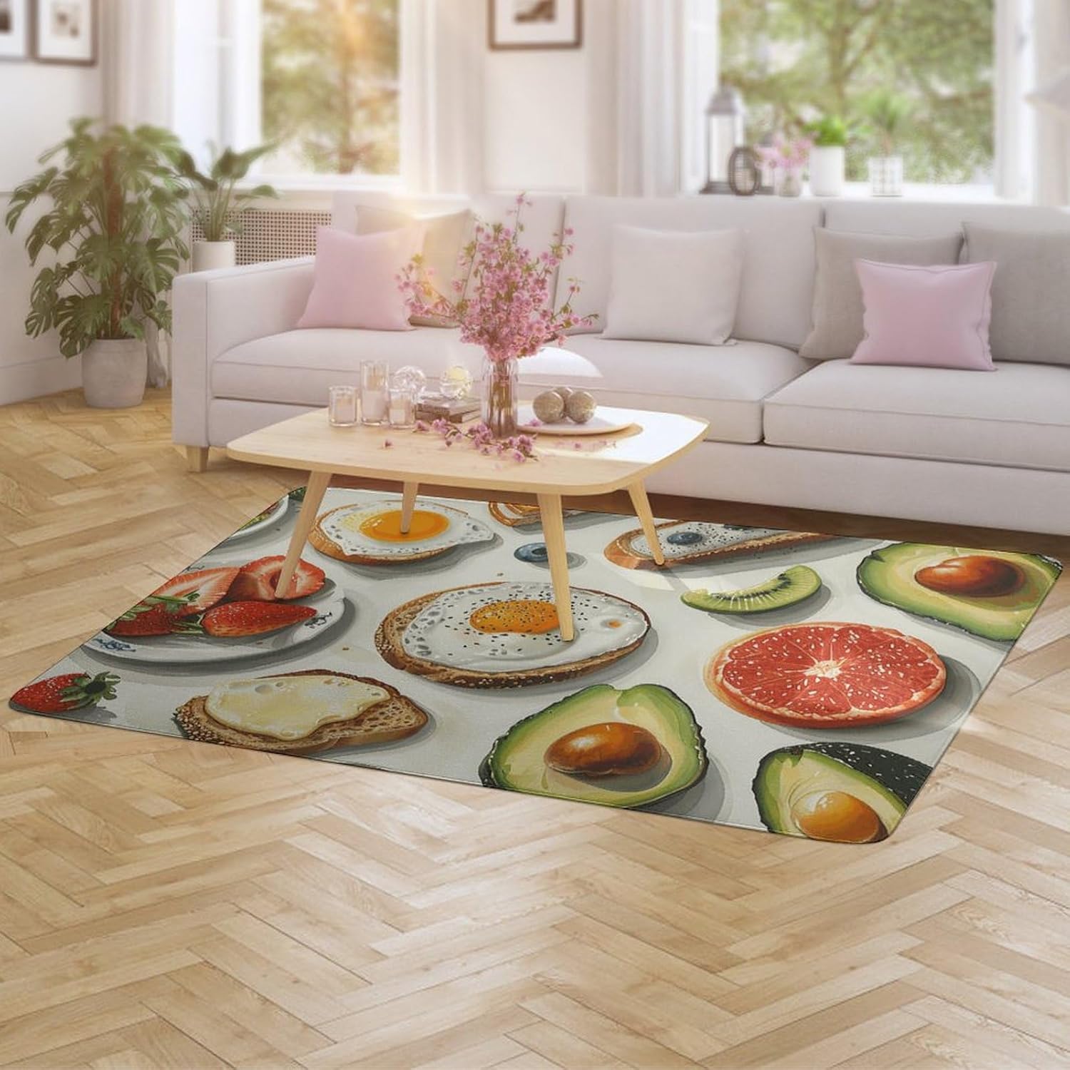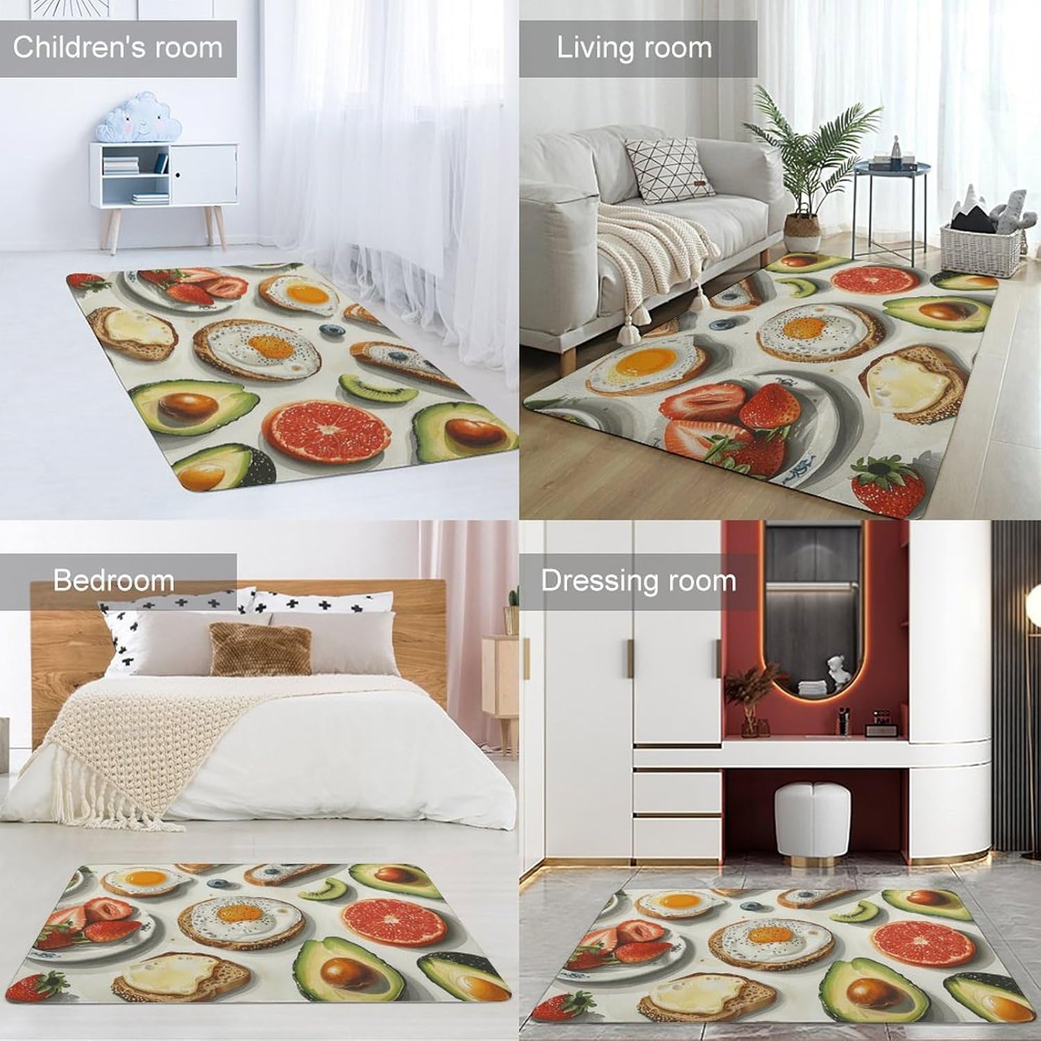[high quality:]Breakfast Food Drawing area carpet 39x59 Inch, home carpet flannel fabric, high-density space elastic cotton interlayer water absorption, soft touch, no ball, no fading, the Carpet pad middle interlayer is high-density memory foam, which Carpet mat can effectively relieve the pressure of footsteps.[improve the quality of life:]this shag area rug is the focal point of home decor! floor carpet simple and stylish color design creates warm atmosphere, creating a new luxurious place for your life, and the softest touch will make you feel extremely relaxed.[non-slip bottom:]the bottom of the plush living room carpet is covered with thousands of plastic anti-skid points, which provide enough friction with the floor and prevent sliding[dust-release:]soft couch rugs due to its low pile structure and production from flannel fabric, it does not collect dirt or dust. Dining room rug Suitable for kitchen, patio, deck, garden, beach, rv, terrace, and living room.[easy to clean:]gaming rug usually only need to use a vacuum cleaner for simple cleaning.For a deeper clean, Couch rugs can machine washed,abrasion-resistant, and does not lint.