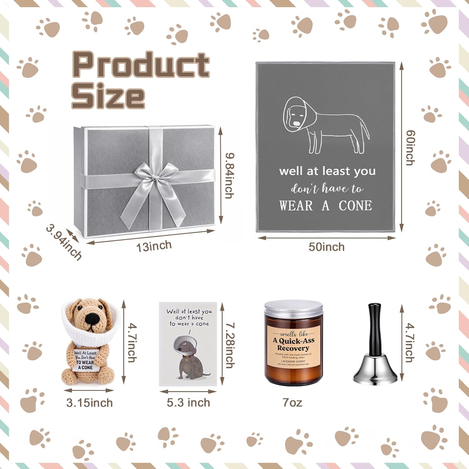 Features: Nice for Various Caring Occasions This versatile after surgery gift basket is suitable for many situations. It serves as a thoughtful after surgery gift, a well soon present for a friend, or an uplifting token for a colleague, helping to build emotional connections and boost morale. Delivering Warmth and Smiles We believe a humorous and considerate gift can bring warmth and strength during tough times. This set aims to convey deep care in a lighthearted way, adding a bright spot to the healing journey. Specifications: Material: Gift box: paper Crochet Dog: yarn Card: paper Color: Gift box: gray Crochet Dog: khaki Hand bell: silver Blanket: gray Size: Gift box: about 33 x 25 x 10 cm/ 13 x 9.84 x 3.94 inches Crochet Dog: about 12 x 8 cm/ 4.72 x 3.15 inches Candle: about 200 g/ 7 ounce Hand bell: about 12 cm/ 4.72 inches Card: about 18.5 x 13.5 cm/ 7.28 x 5.31 inches Blanket: about 130 x 150 cm/ 51.18 x 59.06 inches Package includes: 1 x Gift box 1 x Crochet Dog 1 x Candle 1 x Hand bell 1 x Card 1 x Blanket Notes: Manual measurement, please allow slight errors on size. The color may exist a slight difference due to different screen displays