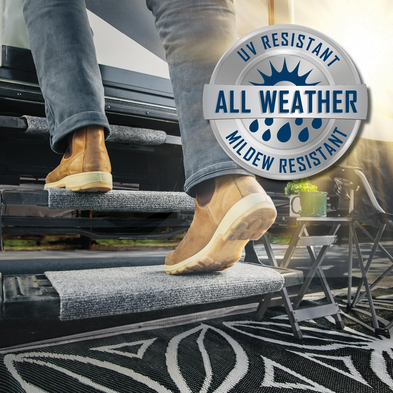Keep your RV clean with Camco's Wrap Around RV Step Rug! Say goodbye to tracked-in dirt and debris with this essential camper step cover. Keep your RV living space clean and inviting on all your adventures. Crafted from weather-resistant materials, this RV must-have is built to last. Easily install it on your existing camper step for a secure fit every time. Rest easy knowing your camper is a cozy retreat while on the road! Elevate your RV camping experience with Camco’s Wrap Around RV Step Cover. This stylish, functional, and long-lasting RV accessory will enhance your outdoor adventures like never before!
