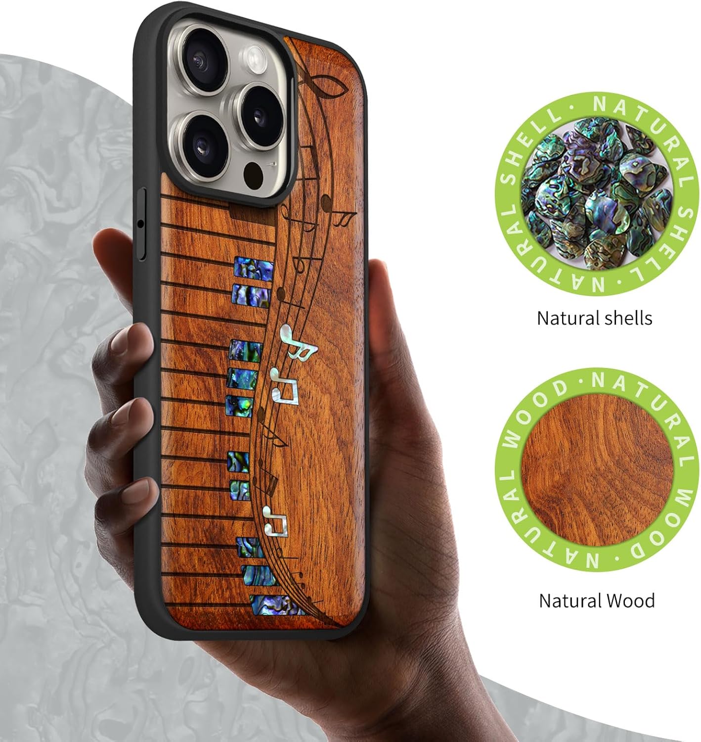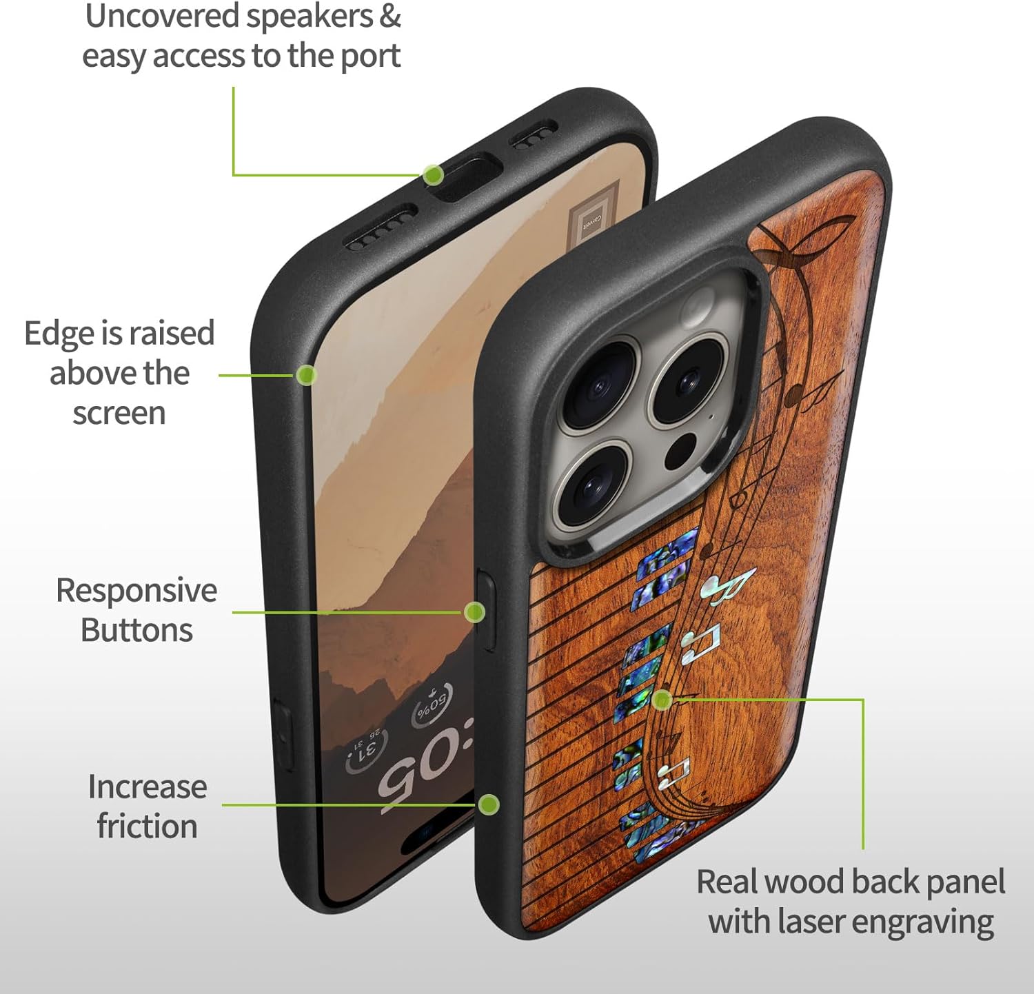 | Additional Features | Natural solid wood back panel and laser engraving, The unique solid wood keeps the palm dry and prevents fingerprints from sticking to the surface of the case, keeping it clean and elegant |