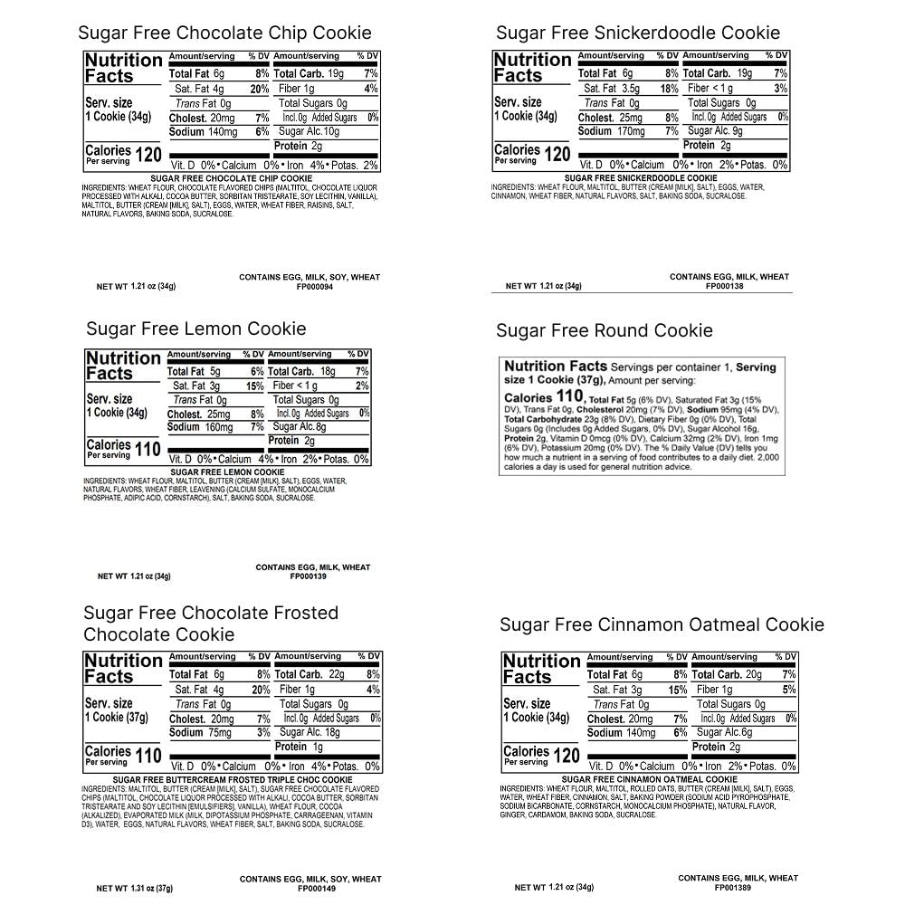 | Flavor | Chocolate Chip, Snickerdoodle, Lemon, Buttercream Frosted, Triple Chocolate, Cinnamon Oatmeal, Sugar Free |