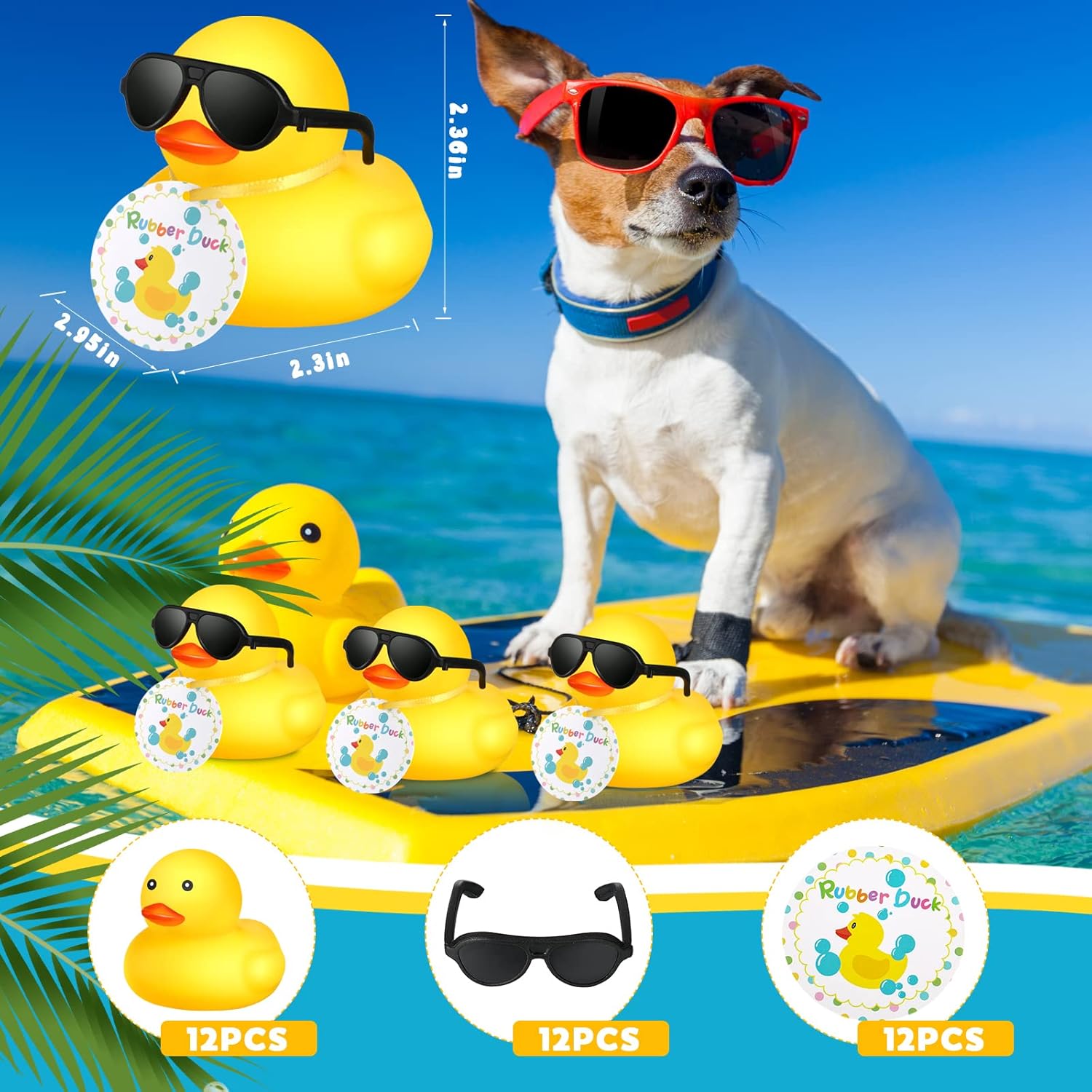 Features: Adorable decoration: With cute cards and sunglasses accessories, these rubber ducky bath toy are more adorable and easy to attract people's attention, pretty enough to be party ornaments, desktop decoration, car dashboard decor and more, creating sweet and warm air. Lightweight and small rubber ducks: The baby shower duck is lightweight and small to easily carry around, so you can take it with you when you travel with your family and make it a loyal growing partner for your loved ones. Specifications: Material: rubber Size: approx. 3 x 2 inches Color: as shown Package includes: 12 x Bath toys rubber ducks 12 x Mini sunglasses 12 x Mini cards Notes: Manual measurement, please allow little size errors. Please allow slight color difference due to different monitor. Choking risk may exist, please keep away from little ones.