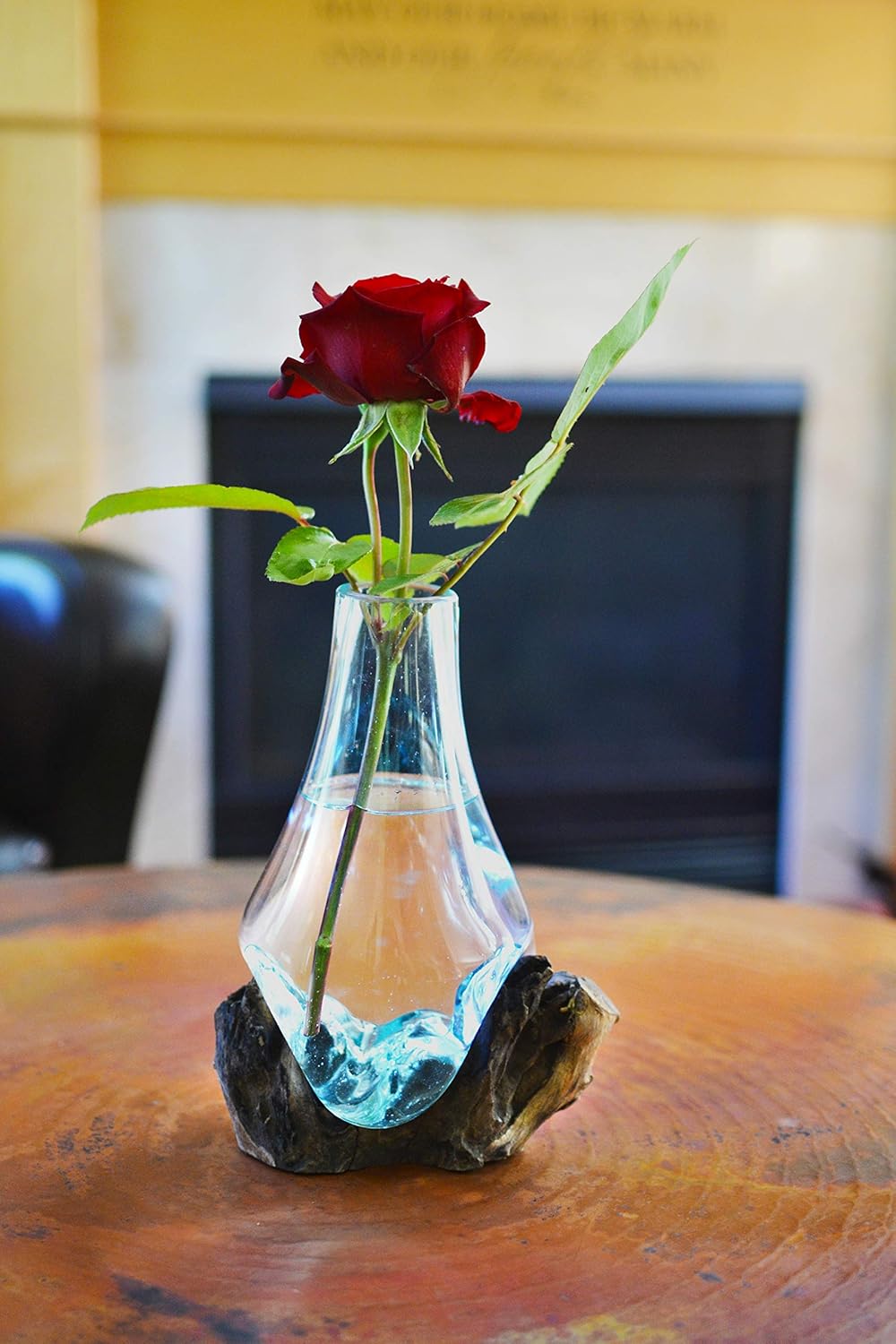 Recycled Molten Glass is pressed upon a unique piece of tropical hardwood to create a one of a kind piece of art. Cohasset Molten Glass Stem Vase is the perfect vessel for your favorite flowers, sand or other keepsakes.