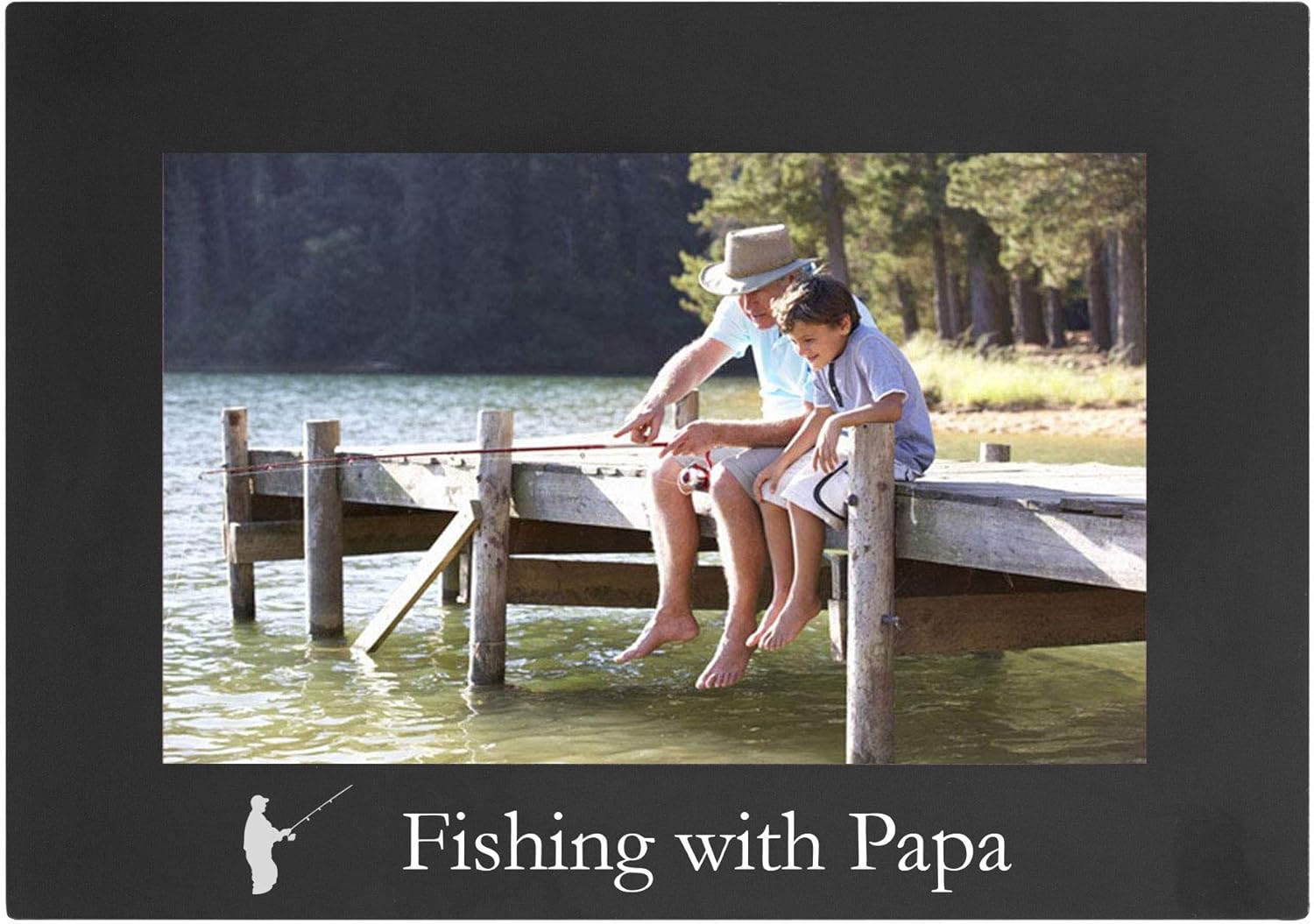 This fishing grandparent picture frame gift can make a suitable memorial for a first time fishing, fishing at camping, ocean, lake or river fishing and can also be a gift for a grieving family as a rememberance of good memories. The frame has a folding easel on the back and hangers to hang the frame on the wall. A Loved one can always be remembered with this beautiful aluminum font frame. Lightweight frame. The engraving reveals white under the black anodized aluminum.