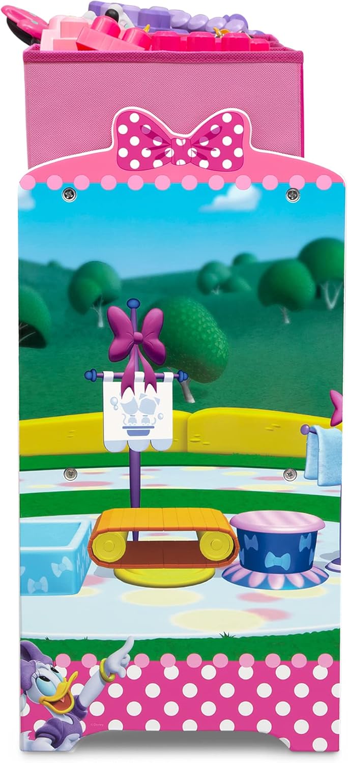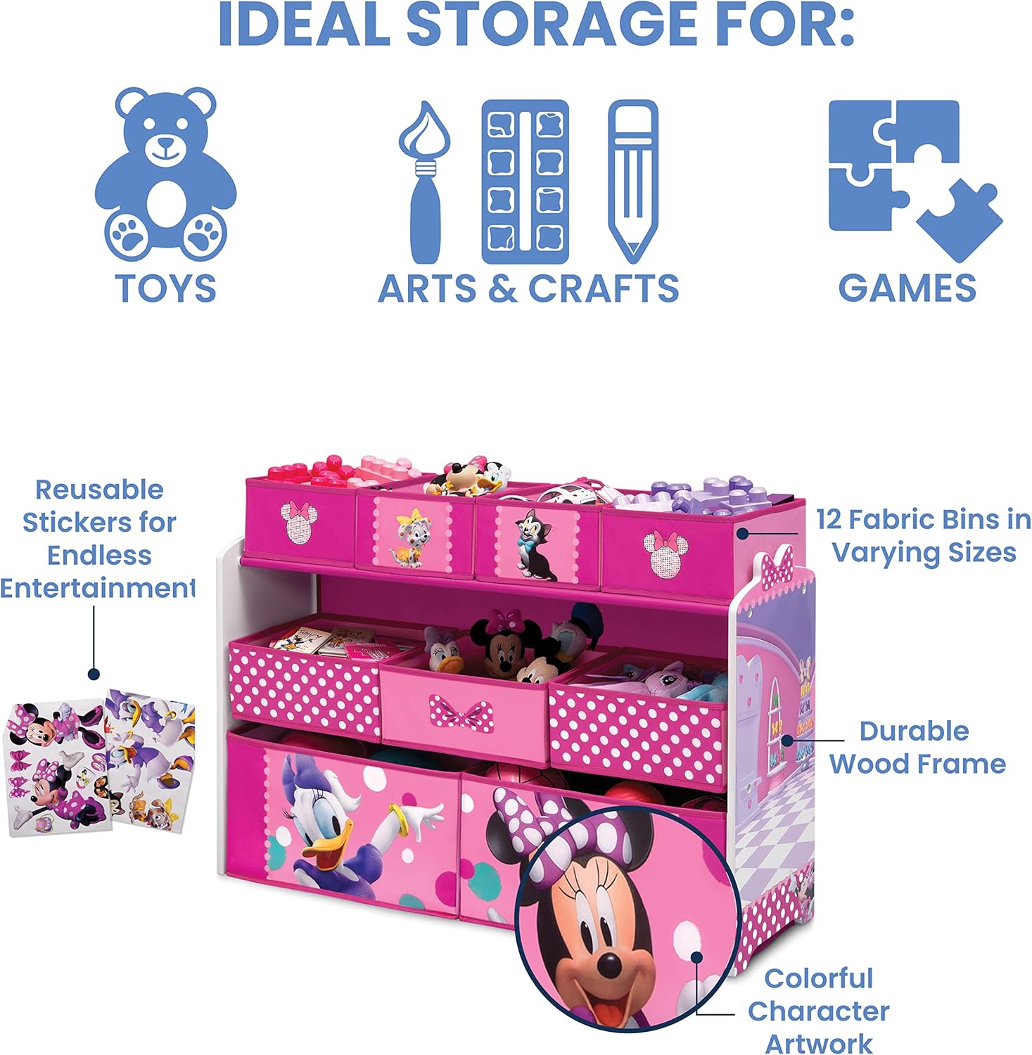 The Disney Minnie Mouse Deluxe 9 Bin Design and Store Toy Organizer by Delta Children allows kids to join Minnie and her friends on a cleanup adventure! Designed for little kids with big imaginations, this cool toy storage bin features colorful graphics of Minnie. Plus, this convenient toy bin comes with reusable vinyl cling stickers that allow your child to decorate the sides themselves. The stickers feature memorable characters and objects that will encourage kids to create magical scenes on the sides of the bin. Supported by a sturdy frame, this practical storage piece features nine fabric toy bins in three different sizes to stow a ton of toys. A great option for any bedroom, playroom or living room, the Minnie Mouse Deluxe 9 Bin Design and Store Toy Organizer by Delta Children is ear-resistible. About Minnie Mouse: Sweet, stylish and a lover of all things polka dot, Minnie Mouse spends her free time dancing, singing and hanging out with her lifelong sweetheart, Mickey. Help bring her cheerful spirit to your little one's room with this item from Delta Children's colorful collection of Minnie Mouse kids' furniture.