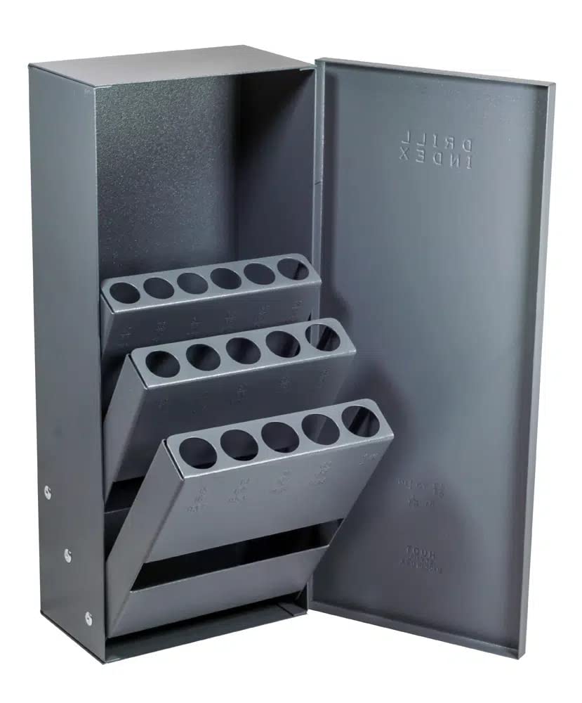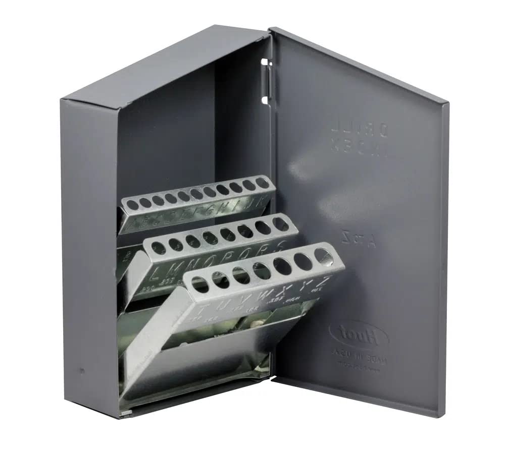 Drill America HUT Series. Rugged, heavy gauge all–steel case holds sizes 1/16-1/2", #1-60, A-Z (115 Sizes). Each storage hole precisely sized for accurate, quick selection. All steel case. Corrosion resistant, epoxy baked on coating with a secure, snap-lock steel cover. Made in U.S.A. Identification number: 11700