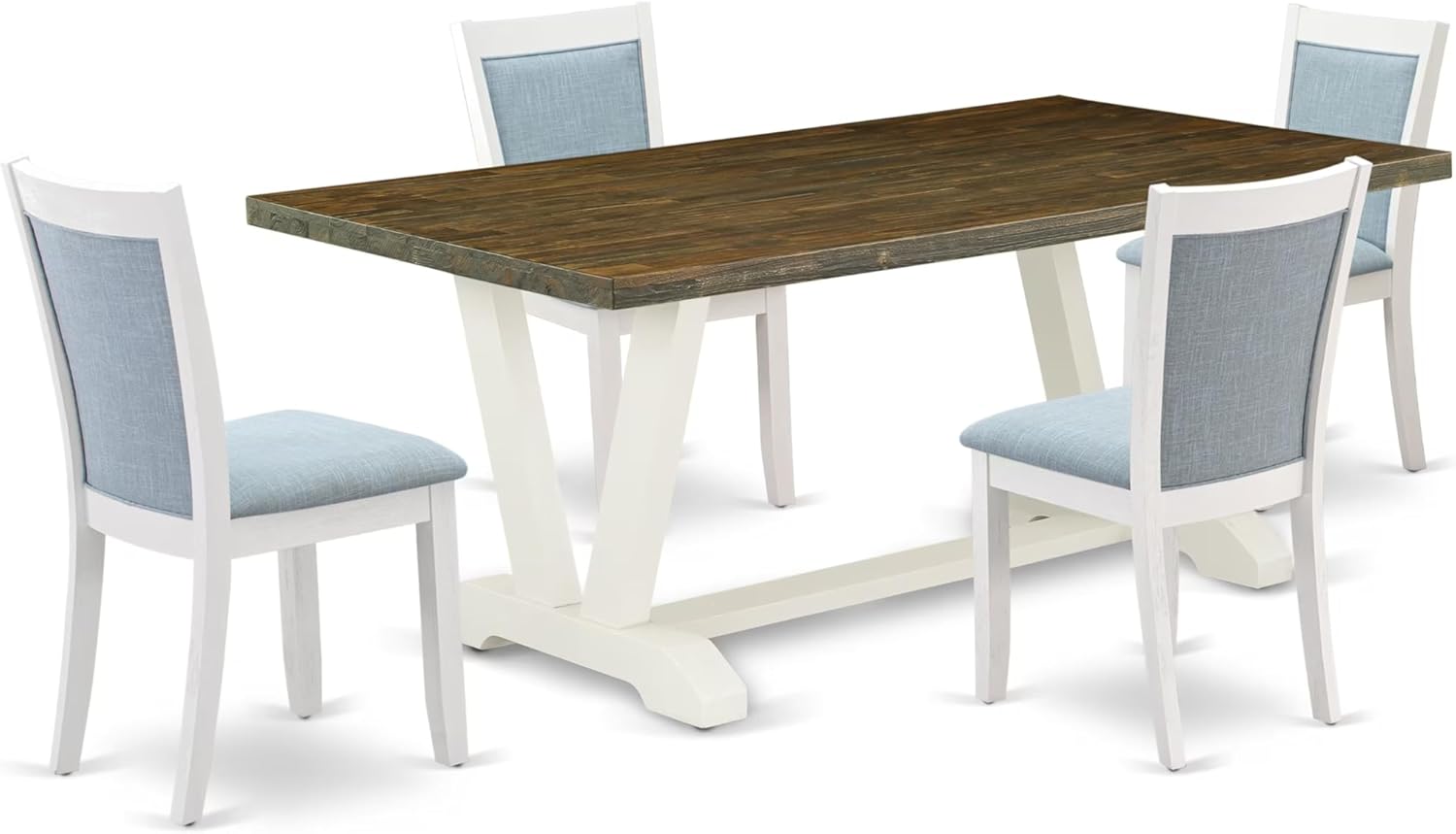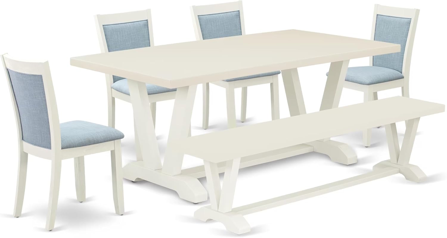 EAST WEST FURNITURE - X027MZ015-6 - 6-PC MODERN DINING SETOur captivating dining room table set is sure to elevate the aesthetics of any dining space with its chic design and decoration. This 6-Piece dining table set comprises an appealing dining table, 4 coordinated parson dining chairs, and a petite wooden bench. Adding a touch of modern elegance to your home, this dining table set is perfect for kitchens, breakfast nooks, and dining areas. It accommodates up to 6 people comfortably, making it ideal for family gatherings and meals with friends. This kitchen table set will enhance the visual appeal of any dining room, thanks to its timeless design. The mid-century modern table features a Linen White tabletop and X-style legs finished in Wire Brushed Linen White. The dining chairs are upholstered in Baby Blue Linen Fabric with Linen White solid wood chair legs. They offer both comfort and style, with linen fabric seats and stylish backs. The parson chairs have wooden frames outlining the back, and the center of the backrest is padded for extra comfort. Crafted with the expertise of highly skilled carpenters, this kitchen table set boasts a smooth and high-quality finish.PRODUCTS FEATURES:Material: Asian WoodFabric Type: Linen FabricFabric Color: Baby BlueTable and Bench Top Color: Linen WhiteTable and Bench Legs Color: Wire Brushed Linen WhiteChair Legs Color: Linen WhiteTable Legs Shape: X-StyleChair Back: Stylish BackTable Dimensions: Length: 72; Width: 40; Height: 30.Chair Dimensions: Length: 19.5; Width: 17.7; Height: 36.8.Bench Dimensions: Length: 72; Width: 15; Height: 18.Include in this Package: 6 Piece Dining Room Table Set - 1 Dining Table - 4 Upholstered Chairs and a Dining Bench.