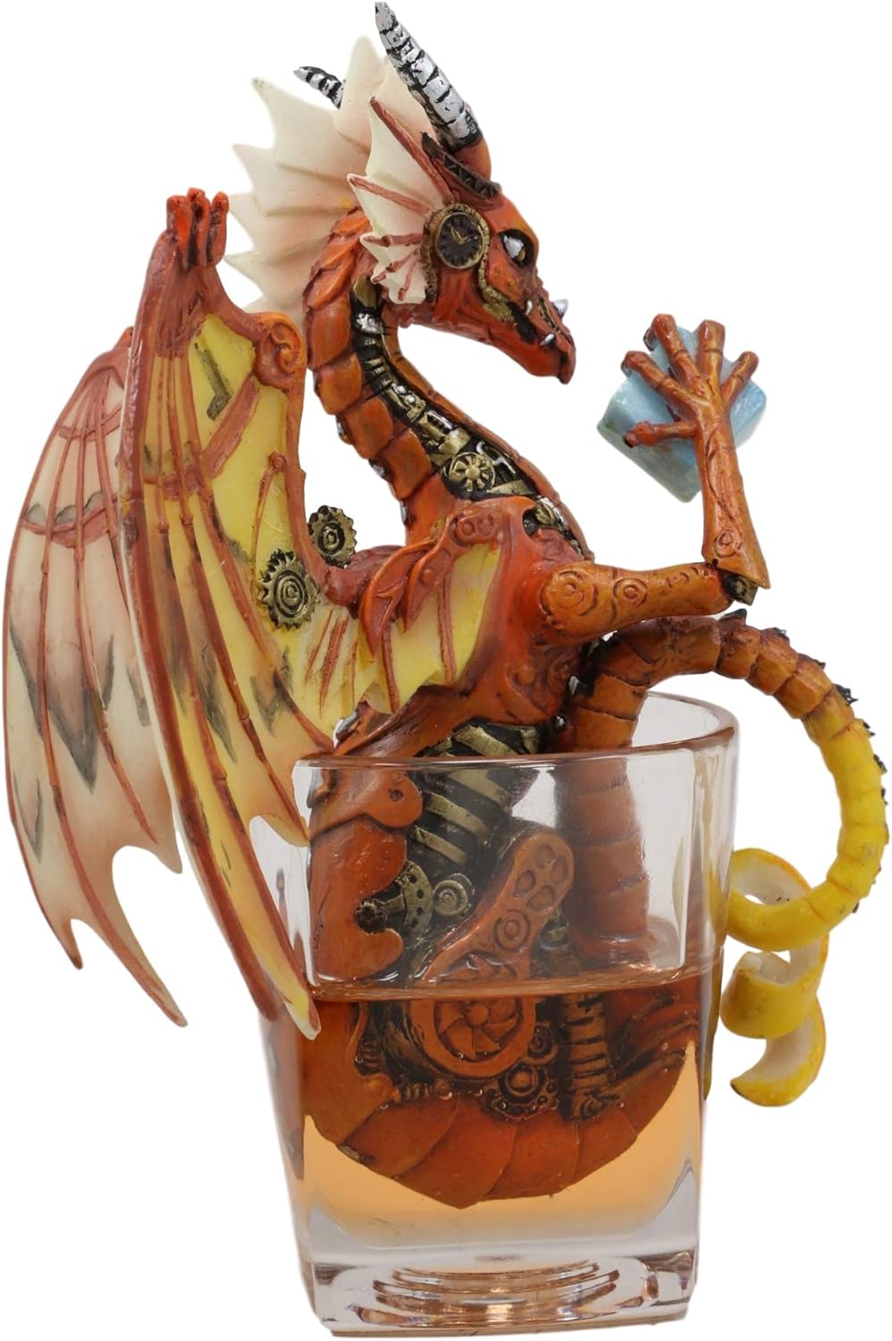 This cute and mischievous dragon would look great in a kitchen/bar or anywhere you need to put a little fantasy in your house. It features a robotic steampunk dragon sipping away a Cointreau orange cocktail. Perhaps he thought the orange colored cocktail is lube for his gear parts! This Steampunk Cocktail Dragon Statue is approximately 7" tall and 5.25" long and 4.25" deep. It weighs about 13 ounces.