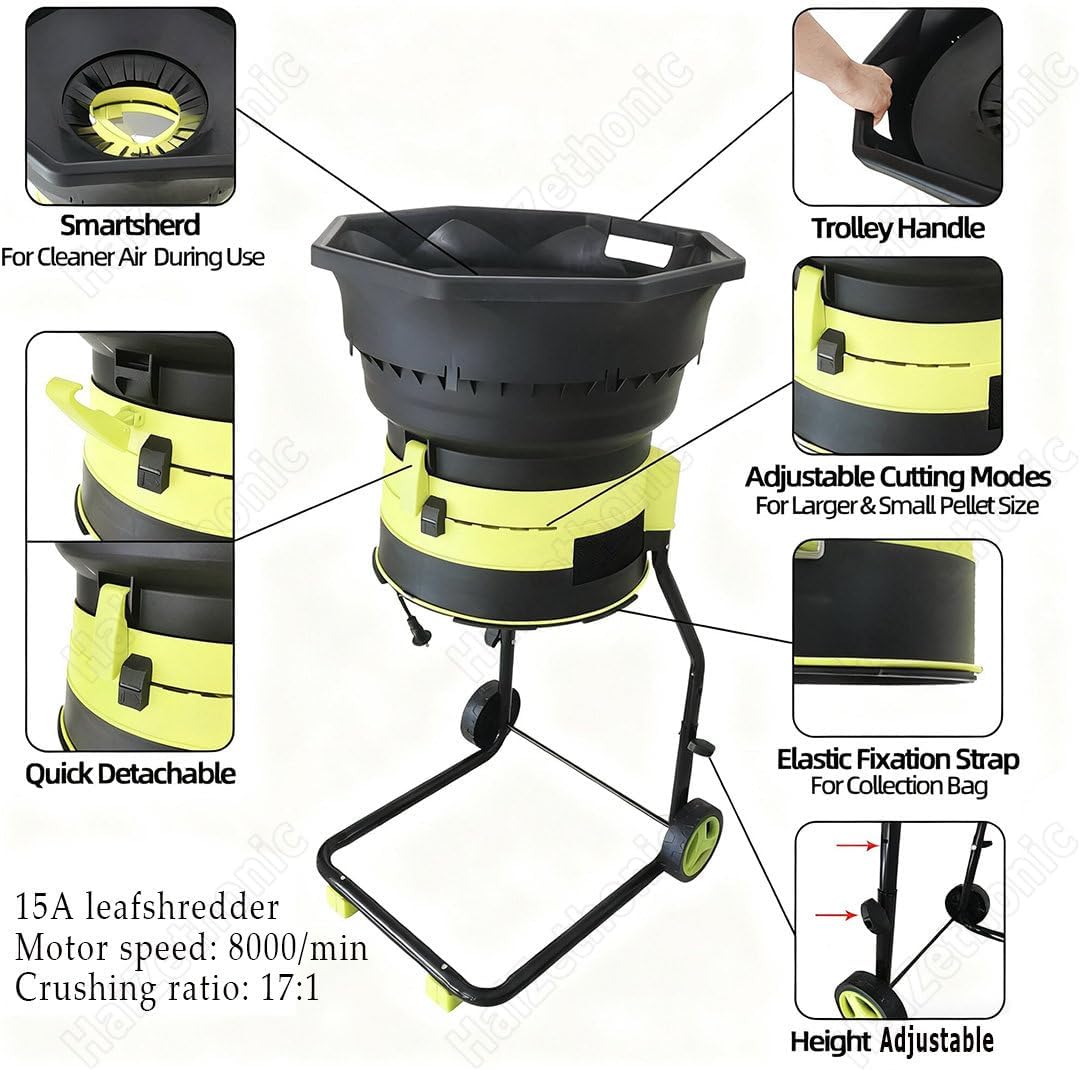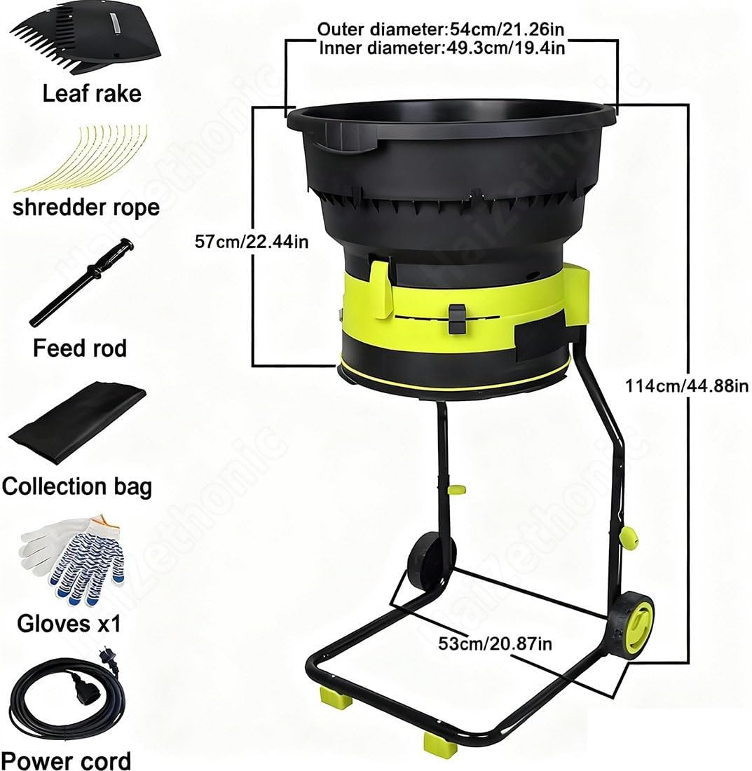 ☛☛☛ Product DescriptionStill troubled by fallen leaves in autumn? Let the 2500W HaiZethonic powerful leaf shredder solve your problem! Utilizing safe bladeless technology, it quickly transforms fallen leaves into nutrient compost, helping you quickly manage your yard and easily keep it tidy!☛ Specifications:- Name: Electric Leaf Chopper- Power: 2500 W- No-load Speed: 8000 rpm/min- Crushing Ratio: Approximately 17:1- Outer Hopper Diameter: 54 cm/21.3 in- Inner Hopper Diameter: 49.3 cm/19.4 in- Cut Line Length: 32 cm/12.6 in- Cut Line Thickness: 0.25 cm/0.1 in- Capacity: 208 L/min- Packing Dimensions: 52.5*37*51 cm/21 × 15 × 20 in- Packing Weight: 9 kg/19.84 lb☛ Packing List:- 1 Electric Leaf Chopper- 1 Leaf Rake- 10 Leaf Chopping Ropes- 1 Feed Rod- 1 Collection Bag- 1 Pair of Gloves- 1 10m/20m/30m/40m Pole 50m/60m power cord (choose according to your needs)☛ Customer Service ☚1. Please note that the actual color may vary slightly due to differences in monitors and lighting conditions.2. Please allow for a 0-2cm error due to manual measurement. Thank you for your understanding.3. If you have any questions during use, please feel fr ee to contact us. We will reply within 24 hours. Have a nice day!
