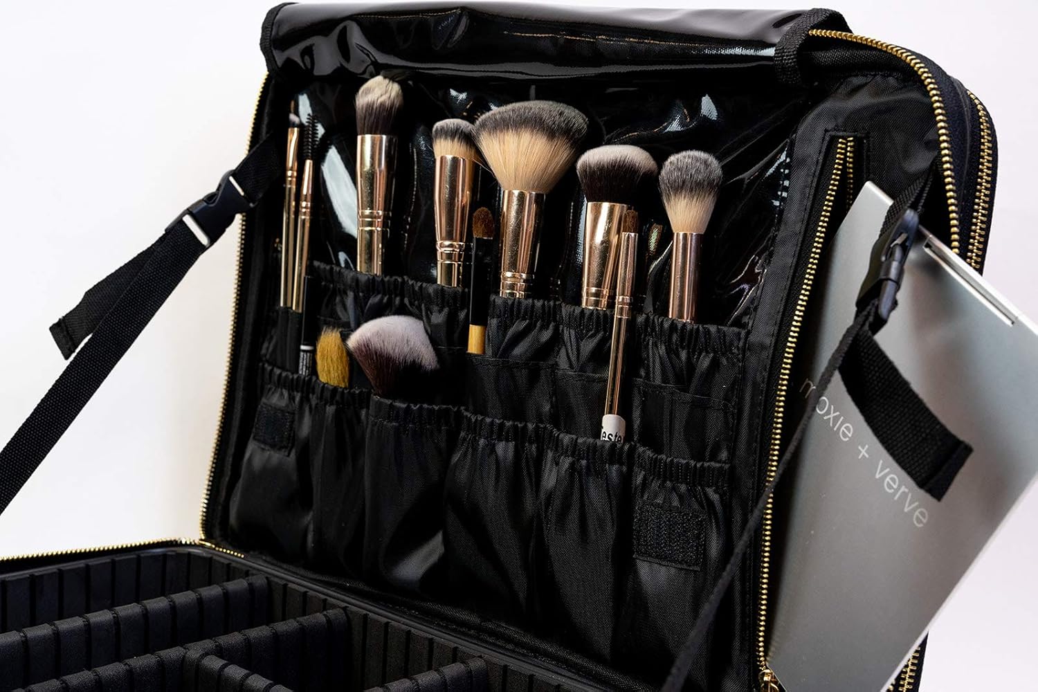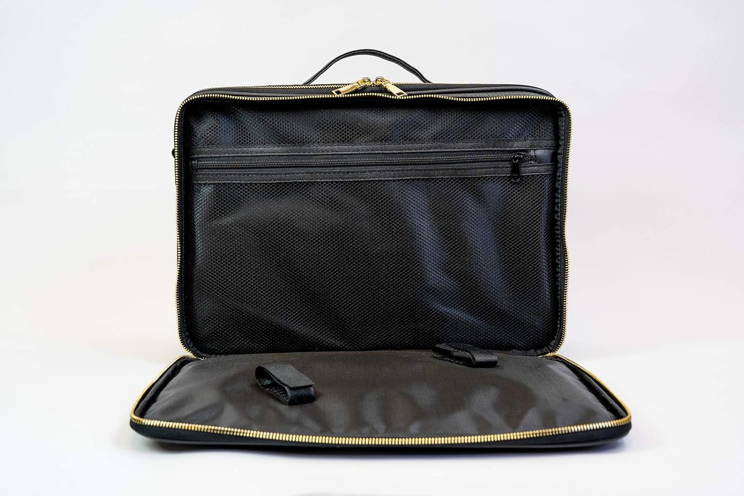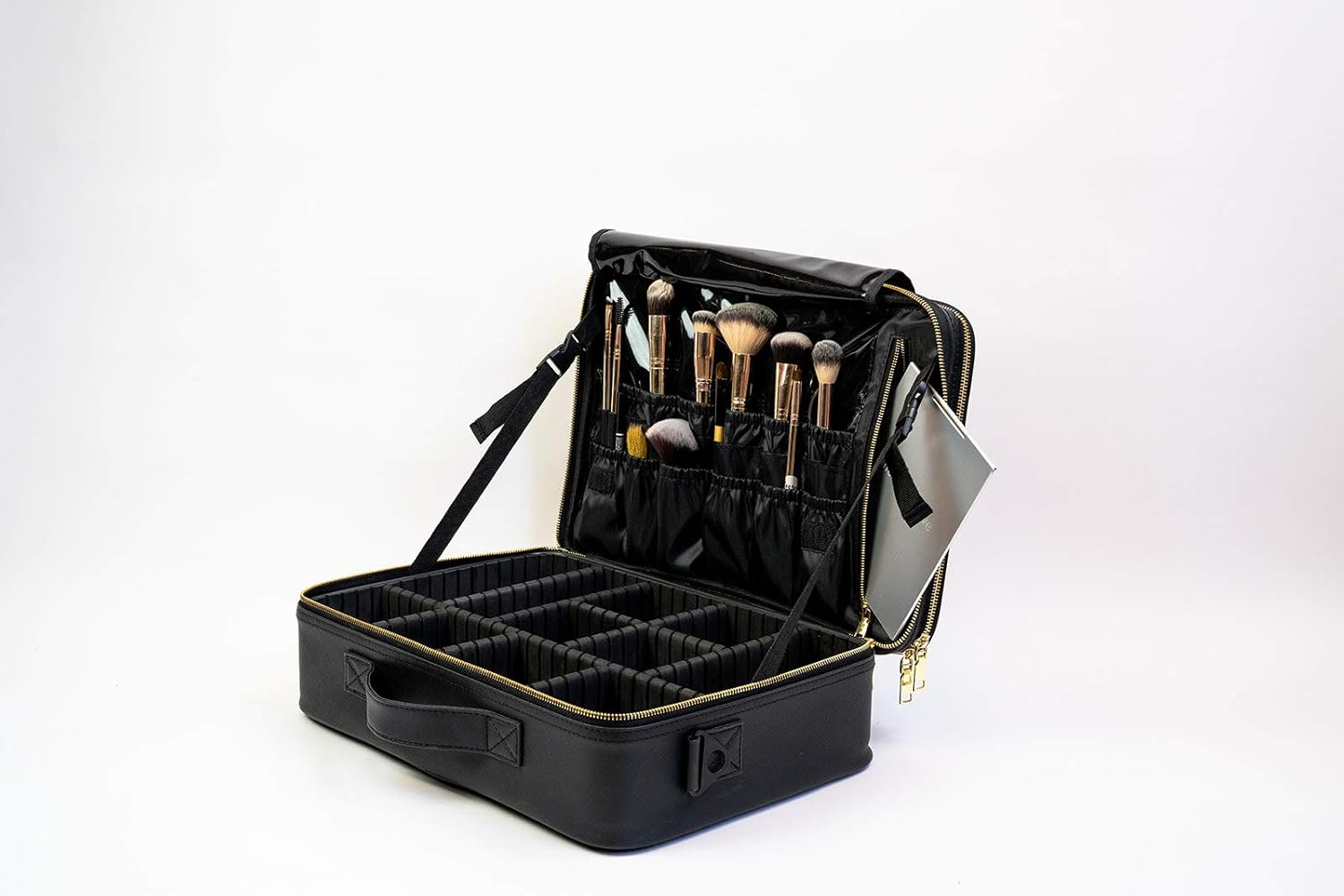 The ultimate vegan leather makeup train case for busy on-the-go makeup artists and avid makeup fans. This dual compartment weekender bag allows you to safely travel with all your beauty products stored in their own compartments. Interchangeable dividers allow you to customize container sizes in the main compartment. There are slip pockets for brushes or lip products, and a stand up mirror that stores away. Use the second compartment to stow away your laptop, multiple makeup artist palettes, and or your hair tools. Traveling with a suitcase? No problem! Slip the trolley sleeve over your trolley handle and don’t worry about it falling over! Carry your bag by hand, shoulder, or as a backpack to be hands-free. This weekender bag comes in Jet black and in Ballerina pink Saffiano vegan leather for a chic, durable, and easy to clean exterior.