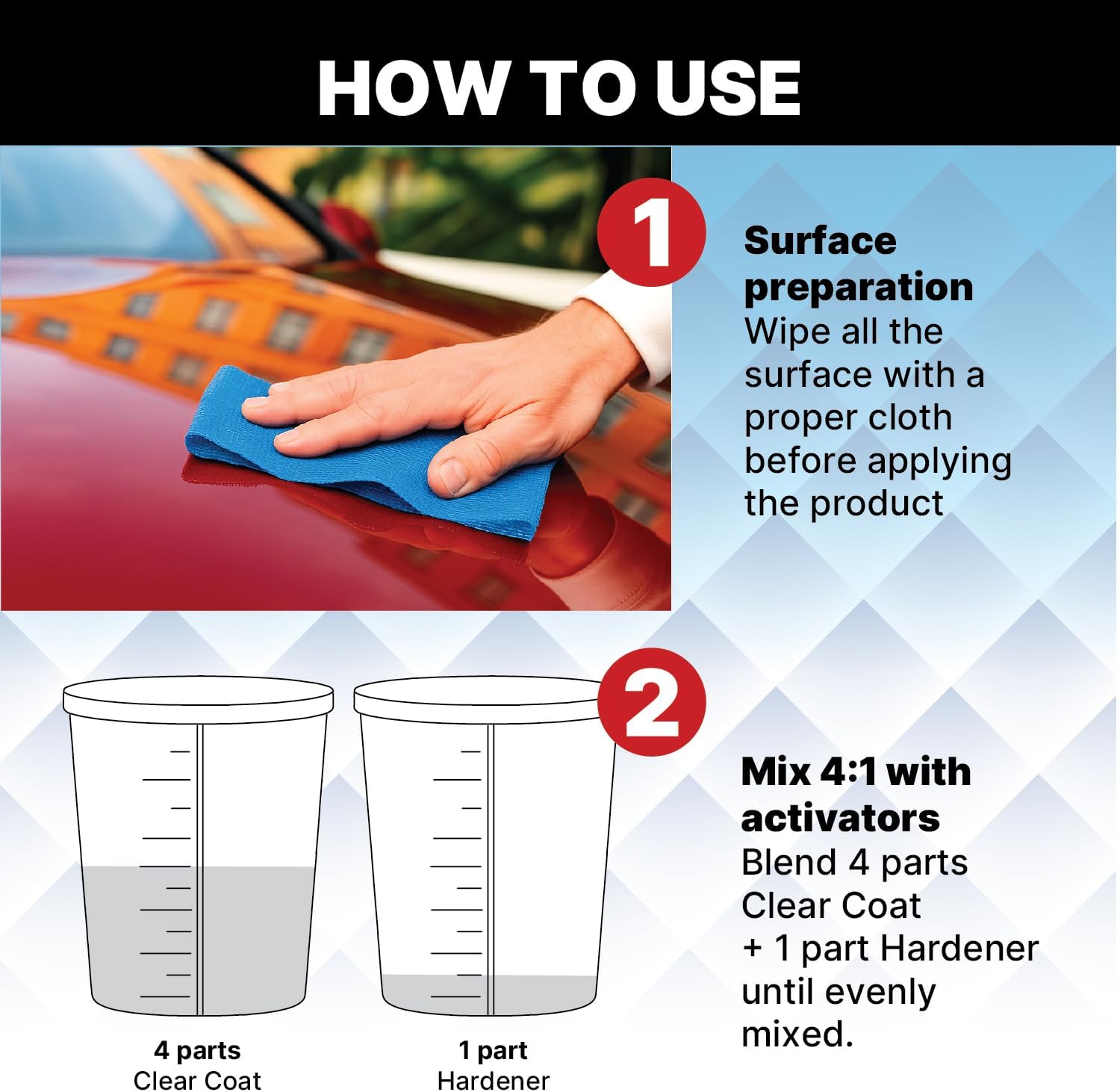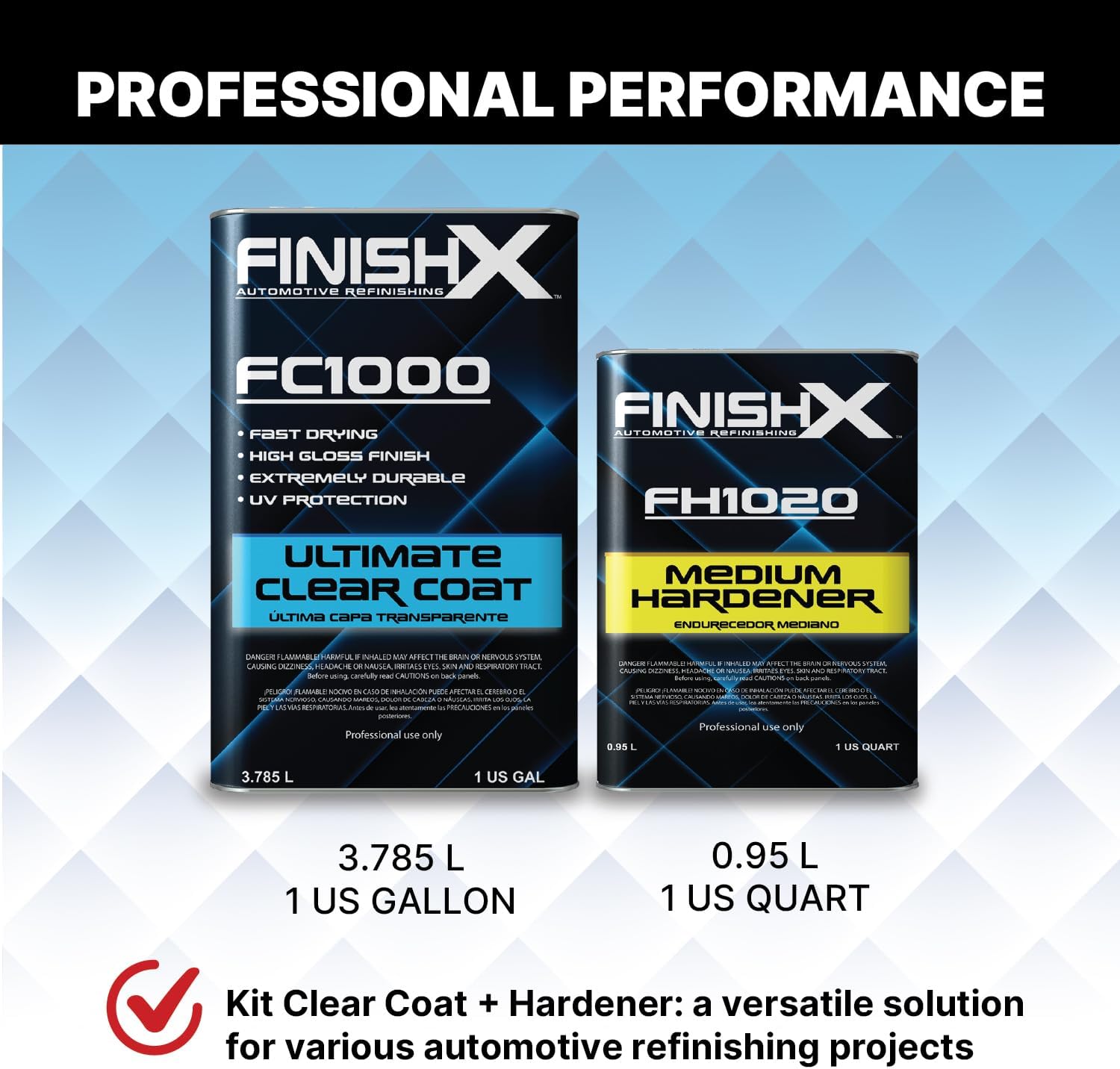 THE KIT: You’ll get 1 Gallon of Ultimate Clear Coat and 1 Quart of Activator/Hardener Transform your car's appearance with our FinishX Automotive Refinishing Ultimate Clear Coat! Our top-quality clear coat is specifically designed to provide your car's exterior with superior protection against UV rays, weathering, and other environmental factors. Its high-gloss finish not only enhances your car's appearance but also seals in and protects the paint underneath, ensuring that your car's color stays vibrant and glossy for years to come. The FinishX Automotive Refinishing Ultimate Clear Coat is easy to apply and provides long-lasting durability, making it the perfect solution for car enthusiasts and professionals alike. Trust us to protect your investment and give your car a showroom-quality shine that will turn heads and make you the envy of the road. The FinishX Automotive Refinishing Ultimate Clear Coat provides a hard, durable, and high-gloss finish that not only protects your car's paint but also enhances its overall appearance. It's formulated with advanced UV inhibitors that keep your car's color looking new and vibrant for years to come. Choose our FinishX Automotive Refinishing Ultimate Clear Coat for unbeatable protection, shine, and longevity. MEDIUM ACTIVATOR The FinishX Automotive Refinishing Medium Activator is the perfect solution for those looking for a balance between fast drying and slow drying. This specially formulated product is designed to accelerate the drying process of the Clear Coat while still allowing for adequate working time. FinishX Automotive Refinishing Medium Activator provides excellent flow, leveling, and gloss retention, making it the ideal choice for achieving a professional-looking finish. It's also ideal for those who work in moderate temperatures or need to complete a job within a specific time frame.