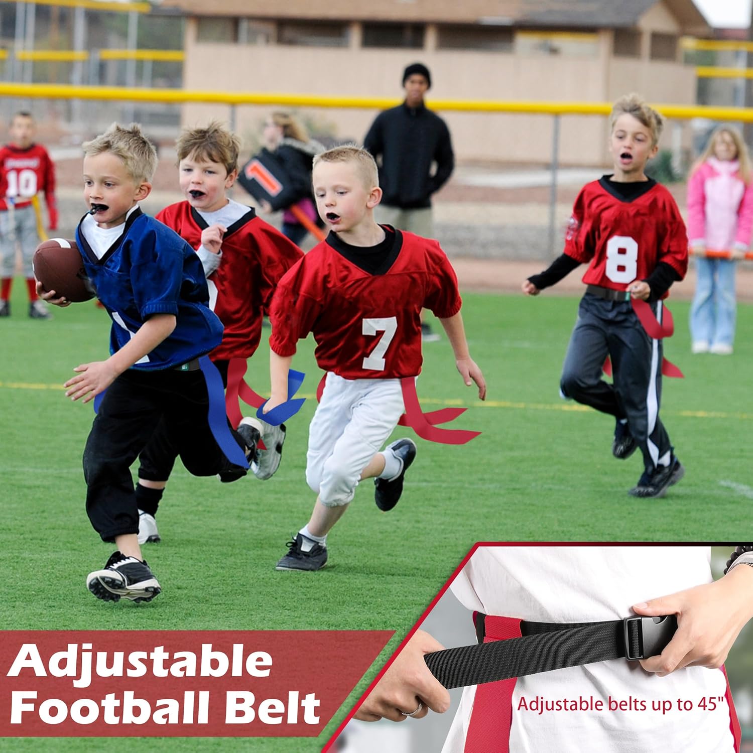Flag Football Belts are suitable for use as kids flag football equipment and as an adult flag football set. Comprised of 24pcs 45" long adjustable football belts and 36pcs red tags+36pcs yellow tags. Tags use hook and loop fastener for easy attachment and removal. Theses flag football sets can be suitable for off season training, can also be applied for a variety of games, such as hide and seek, pick up games, capture the flag, beach fun and more.