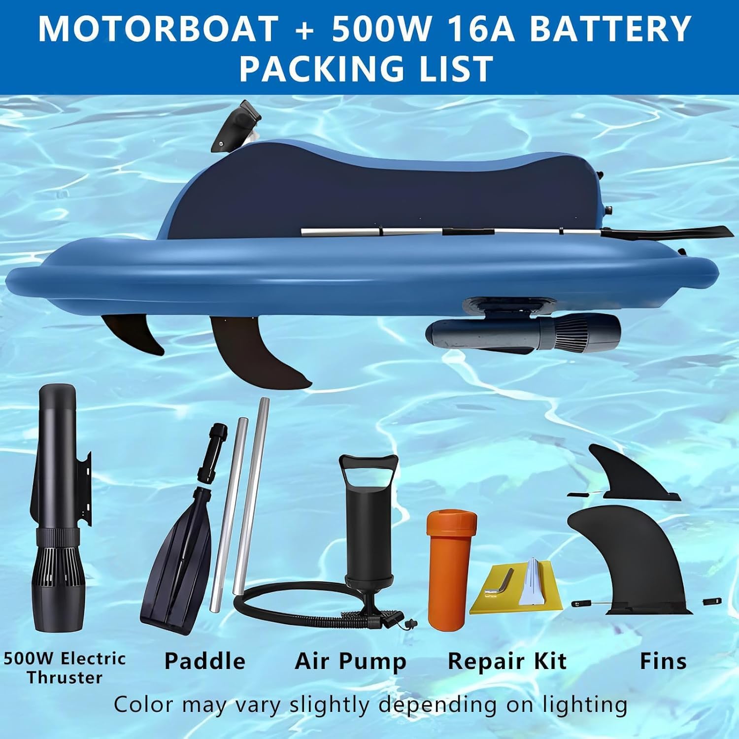 Unleash Summer Freedom: Water Floating Motor Boat!!!Electric Motorized Inflatable Jet Ski Boat for teenage adventurers or adults on long snorkeling expeditions, fishing or coastal exploration. It’s your passport to long days of water fun and exciting adventures – and into summer now!▶【Product Features】✅ Handheld remote control/watch remote control: 10 gears forward and backward adjustment.✅ 500W(700W)+ underwater propeller: generate fast and stable thrust (3-11 km/h).✅ 10,000mAh(16,000mAh) long-lasting battery: 40-130 (35-160) minutes of battery life, you can play longer.✅ Anti-seawater impact structure: with corrosion, impact resistance and drop resistance.✅ 360° quick-release ergonomic handle: fully stable control in any position.✅ Double tail fin stability design: ensure precise steering.✅ Loading capacity 220kg (485 pounds): can carry two adults or a pair of parents and children.▶【Product Specifications】- Name: Water Floating Motor Boat- Battery capacity: 10,000mAh(16,000mAh) 3C/222Wh- Battery life: 40-130minutes(35-160minutes)- Charging time: 3.5 hours- Charging voltage: 25.5V input- Motor: 500W(700W) brushless motor- Speed range: 3-11 km/h- Speed: 1800-2700 rpm- Maximum depth rating: 40 m (131 ft)- Inflated dimensions: 217 x 116 cm (85.5" x 45.6")- Deflated dimensions: 220 x 120 cm (86.6" x 47.2")- Seat dimensions: 100 x 25 cm (39.4" x 9.8")- Weight capacity: 176-220 kg (390-485 lbs)▶【Packing List】- Inflatable motorboat x 1- Air pump x 1- Propeller x 1- Battery x 1- Propeller charger x 1- Diving handle x 1- Repair kit x 1- Remote x 1- Fins large and small x 1- Manual × 1✉ If you have any questions about our products, please feel fr-ee to contact us; we will respond within 24 hours.