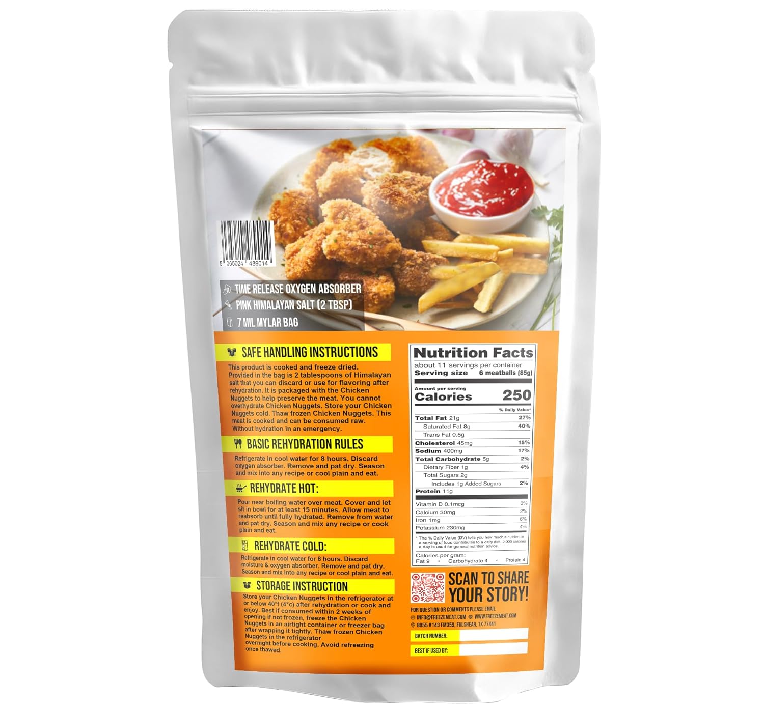 UPDATED PACKAGING - 7 mm Orignal Mylar package that is Vacum packed - we remove the oxygen by Vacum Sealing each bag with a double seal. What oxygen is left is handled by the TIME RELEASE oxygen absorber If a slow leak would develop over the years the oxygen absorber will work to remove that oxygen. please look at the photo on the bag for what the contents actually look like. The Chicken Nuggets Cooked are Freeze dried Freeze Dried Chicken Nuggets Cooked 2 pounds uncooked and raw when it is freeze dried | EMERGENCIES, EVERYDAY USE, FOOD STORAGE, CAMPING and PREPPING. Lightweight pouch requires no refrigeration. EMERGENCIES, EVERYDAY USE, FOOD STORAGE, CAMPING and PREPPING. Lightweight pouch requires no refrigeration. IMPRESSIVE 30-YEAR SHELF-LIFE - Stock up your pantry or emergency food supply with confidence, knowing these steaks will last for decades. Between our propriety freeze-drying techniques, Ultra high-barrier packaging, Your Chicken Nuggets Cooked will be ready to be enjoyed whenever & wherever you are! HIGH PROTEIN and Minimally processed to retain the maximum vitamins and nutrients with no artificial ingredients. QUANTITY & QUALITY - With each resealable pouch containing the equivalent of 2 pounds of fresh CHICKEN NUGGETS COOKED once rehydrated, you can enjoy a generous amount of meat that will taste as fresh & delicious as the day it was packaged. FREEZE MEAT providing safe, reliable food products. Our dedication to quality and safety ensures that you can enjoy our entire line of freeze-dried food products worry-free. CHICKEN NUGGETS COOKED STEAK YOUR WAY. - Grilled, pan-fried, broiled, or baked. Well-done with a char, or perhaps a bit of pink. Our uncooked steaks allow you to prepare them according to your desired taste and well your liking! MADE IN THE USA - Like all of our products, our CHICKEN NUGGETS COOKED are sourced, prepared, produced, and packaged in the United States. We're not reliant on foreign nations, and with FREEZE MEAT products, you won’t be either.