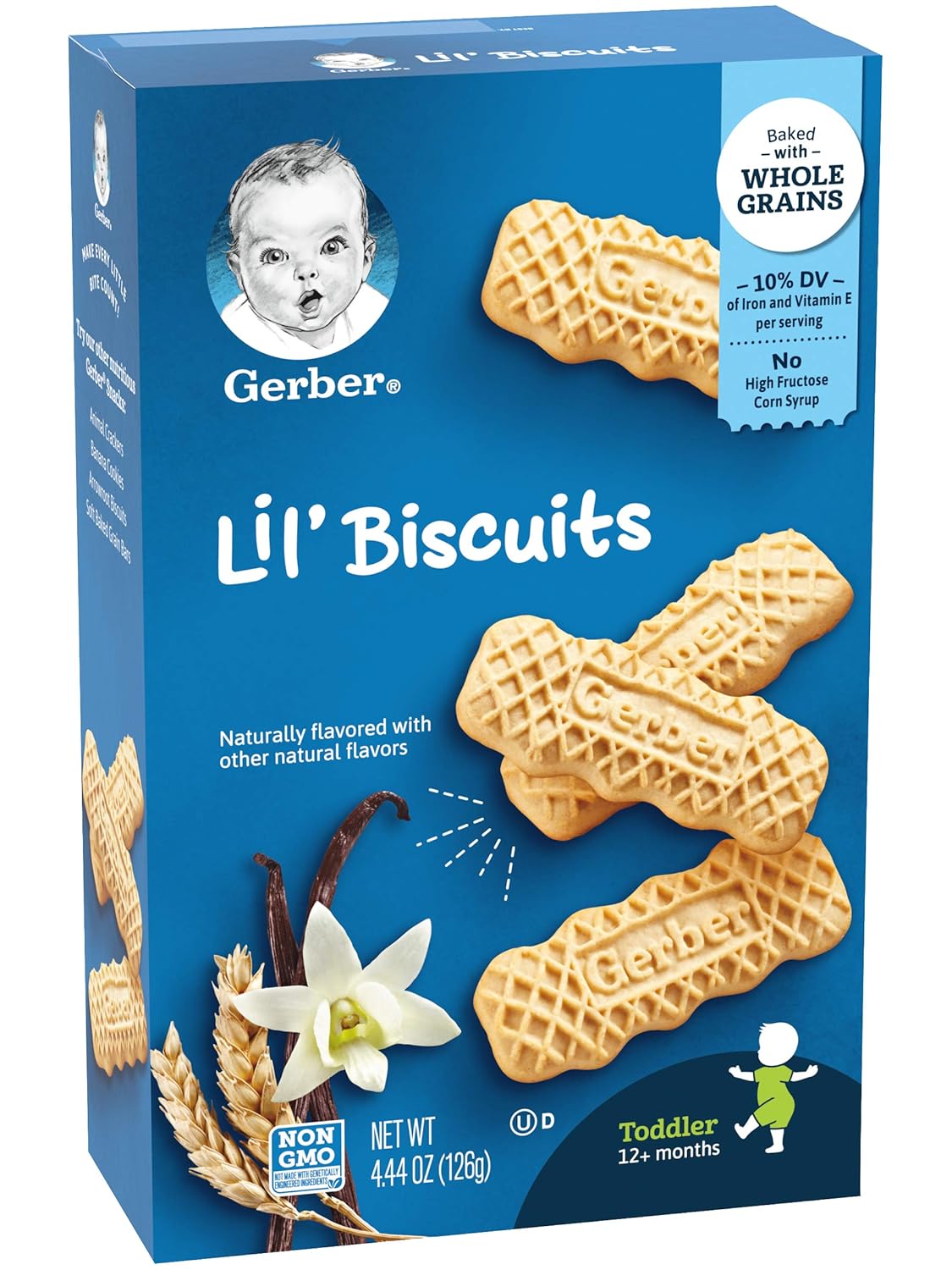 Gerber Lil’ Biscuits Toddler Snack, Baked with Whole Grains & Non-GMO Ingredients, 4.44-Ounce Box: Nourish your little one with the goodness of Gerber Lil' Biscuits. Our yummy Lil' Biscuits are made with 2g of whole grains per serving. They have 3 essential minerals: calcium, iron, and zinc. Gerber Lil' Biscuits - a perfect combination of the delicious taste little ones love and the wholesome nutrition parents love. Self-Feed Like a Pro: Gerber Biscuits & Cookies are perfectly shaped & sized for your little one to practice picking up & self-feeding. Treat baby to high-quality snacking made with wholesome ingredients. Get Em’ To Go: When your little one deserves a fun treat, pull out a delicious box of Gerber Biscuits or Cookies & give them something delightful to munch on – on-the-go! Explore out full range of biscuits made for every age & stage. Made with no artificial flavors, or artificial sweeteners, give your cutie snacks they'll continue to love. Your toddler may be ready for Lil's Biscuits if they: stand alone and begin to walk alone; feed self easily with fingers; bite through a variety of textures.