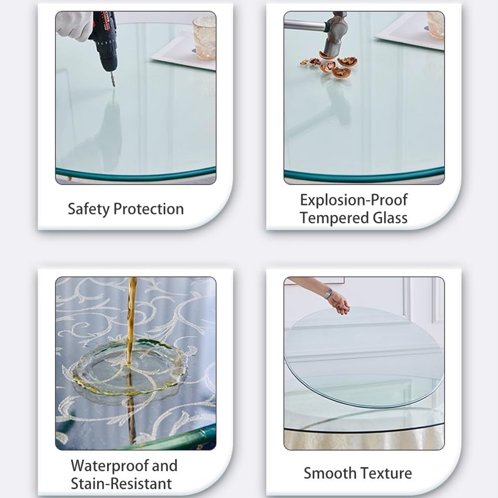 Round tempered glass tabletop made of high-strength safety glass, suitable for office desks, entryway tables, conference tables, dining tables, kitchen tables, patio tables, and coffee tables.SpecificationsName: Glass TabletopShape: RoundThickness: 8mmMaterial: Tempered GlassMaterial Properties: Scratch-resistant, high hardness, strong load-bearing capacity, impact-resistant, heat-resistant, smooth surface, easy to clean.Dimensions: Diameter 28 cm (11 inches) to 98 cm (38.5 inches)Applications: Office desks, entryway tables, conference tables, dining tables, kitchen countertops, patio tables, coffee tables, side tables, and more.Safety WarningTempered glass may shatter into small, harmless fragments upon impact or breakage. While heat-resistant, avoid placing extremely hot objects directly on the surface.
