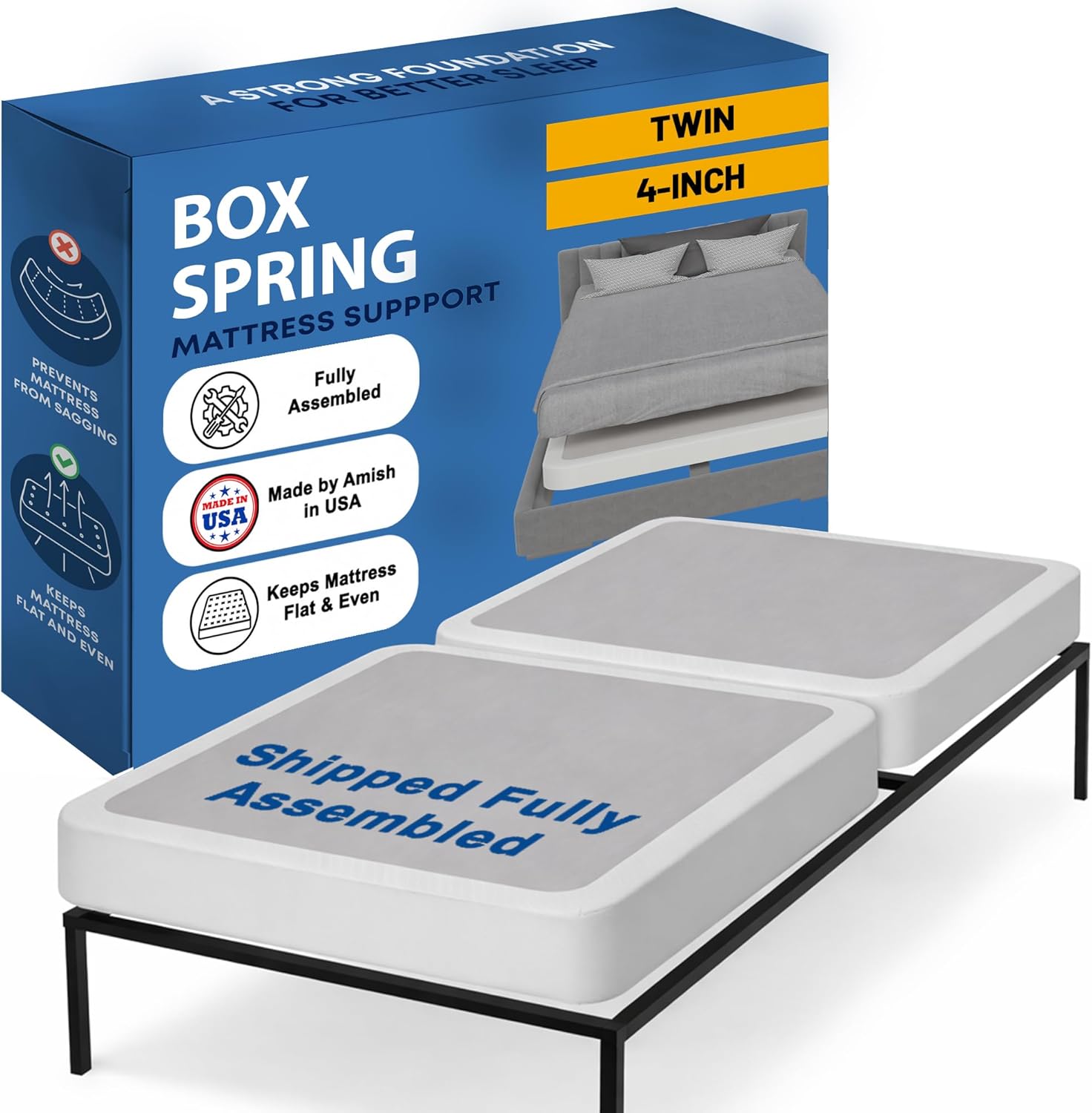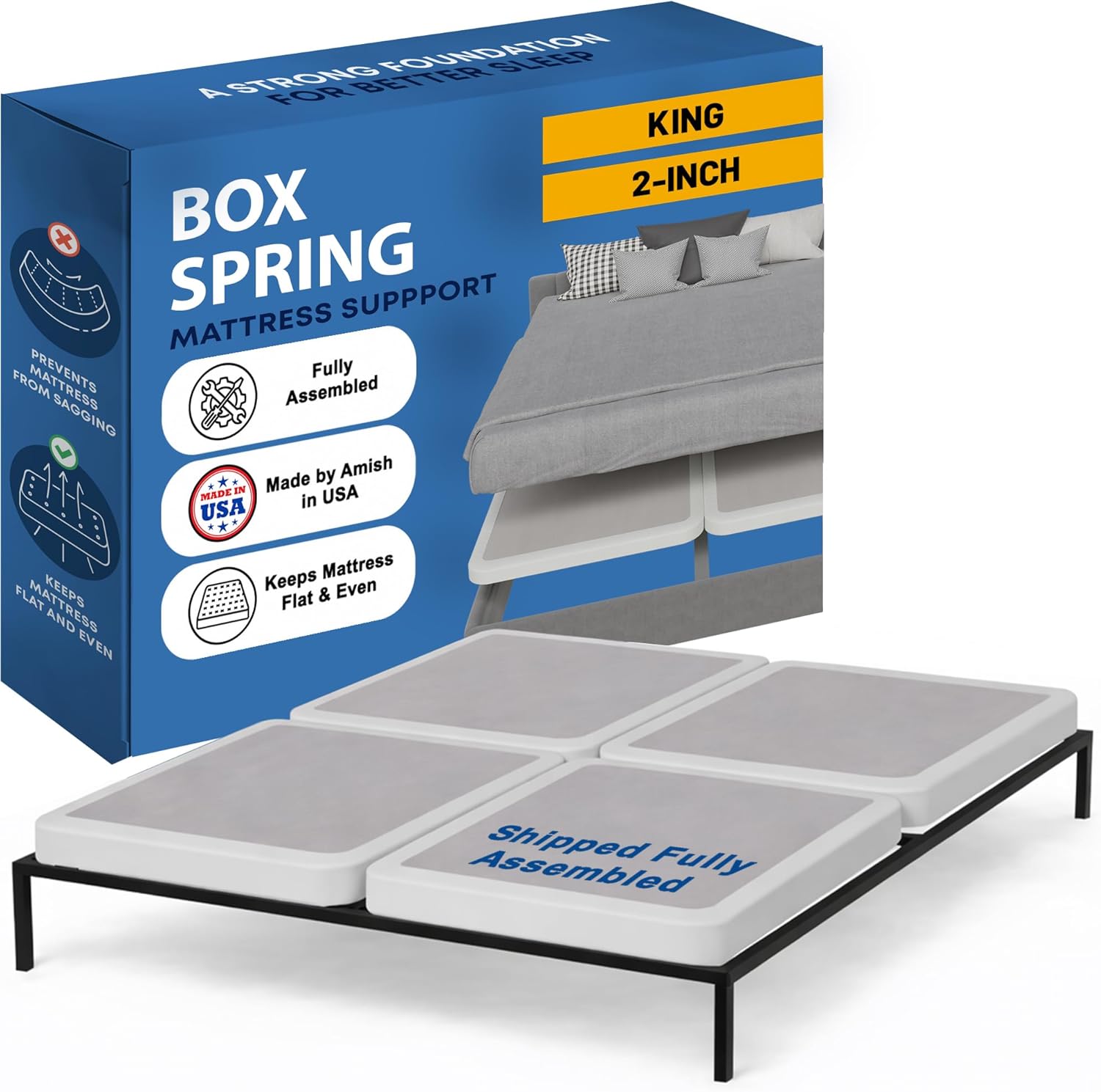 The right kind of smart box spring bed base can change everything & provide mattress comfort and stability. It’s the difference between deep sleep and restless nights. Between a mattress setup that fits easily through stairwells, and one that gets jammed halfway up the landing. Between moving in stress-free… and not at all.That’s why this fully assembled wood box spring was built for real life. Solid wood pieces, durable joints, and Amish craftsmanship come together to give your mattress the support it needs – without the headaches you don’t.Instead of stiff metal or squeaky materials, you get natural wood with just the right amount of give. It stays quiet through the night and comfortable under pressure, helping your mattress feel more supported.PRODUCT SPECIFICATIONS:Sizes: Twin, Twin XL, Full, Full XL, Queen, King, Queen(Fold), King(Fold), California King(Fold)Heights: 2"", 4"" or 8""Colours: White or GrayMaterial: Solid WoodAssembly: Fully AssembledOrigin: Amish-Made in the USAIncludes: Box Spring OnlySPLIT DESIGN FOR EASY TRANSPORTForget the frustration of cramming bulky box springs through doorframes. This comes in split pieces – able to fit through tight stairwells and be easily set up once in the room. Great for any setup, especially if space is limited.SOLID SILENT SUPPORTThe wood frame flexes just enough to be comfortable without creaking or shifting over time. It works with all mattress types like memory foam, latex, spring and hybrid—and gives you a stable, quiet base that stays supportive through the night. Strong support for your mattressMADE IN AMERICA BY THE AMISHThis box spring foundation is made in the USA by experienced Amish craftsmen who take pride in doing things right. From the quality of the wood to the precision of the joints – it’s built with care and built to last.One of the key benefits of this box spring is its ability to absorb pressure, which helps distribute weight evenly across the bed, reducing the amount of pressure on your back, neck, and other joints. Additionally, this box spring is available in a range of sizes and thickness options, including twin, twin XL, full, full XL, queen, king, queen(Fold), King(Fold)and California king(Fold), so you can choose the level of support that best suits your needs and also available in low profile bed base and high profile bed base.Plus, with its sleek and simple design, this box spring will complement any bedroom decor. It is available in two stylish colours, white and Gray, so you can choose the one that best fits your style. Durable frame with horizontal slats for strong mattress supportIn summary, our natural wood box spring is the perfect accessory for anyone who wants a durable, supportive, and fully assembled box spring for their mattress. With its ability to distribute weight evenly, it reduces pressure on your body and ensures a comfortable sleep. Choose from a range of sizes and thickness options and upgrade your bedroom with this must-have accessory today!
