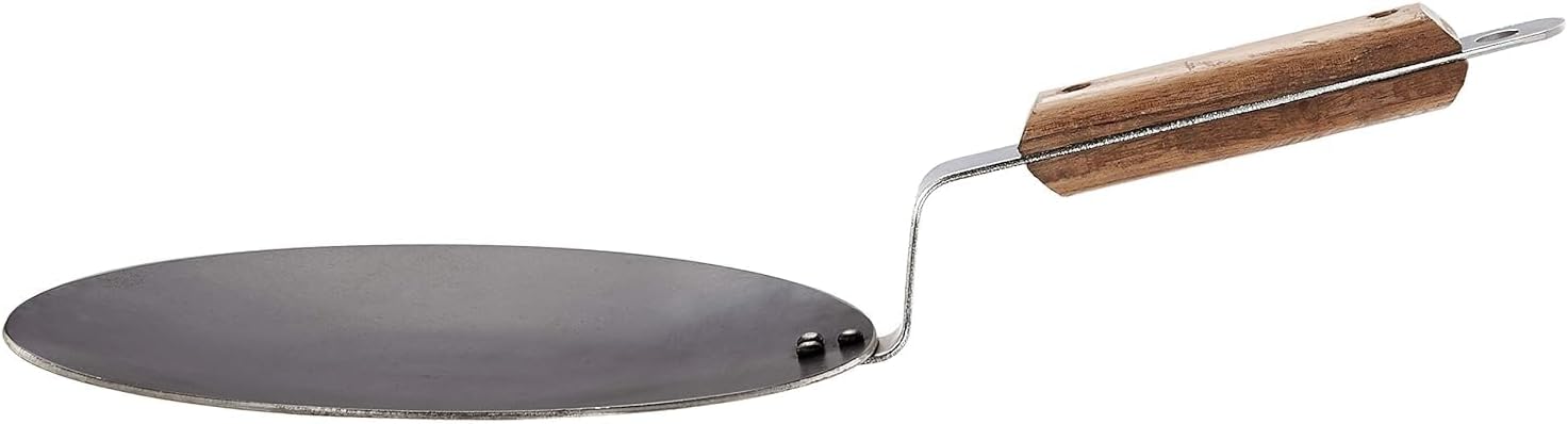 This traditional iron tawa is designed for everyday home cooking and is suitable for preparing roti, chapati, dosa, and other flatbreads. Made from solid iron, it provides even heat distribution for consistent cooking results. The flat cooking surface offers ample space for comfortable use, while the sturdy wooden handle ensures a secure grip during cooking. The simple, durable construction makes this tawa a reliable addition to any kitchen. This 10-inch iron tawa is suitable for gas stove cooking and can be used for a variety of traditional recipes. Easy to maintain with regular cleaning and proper drying after use, it is designed for long-term kitchen use.