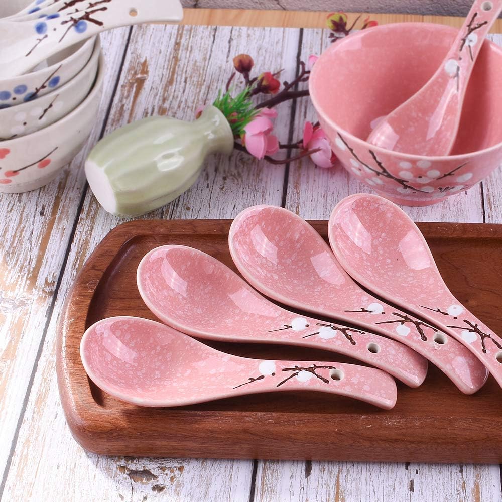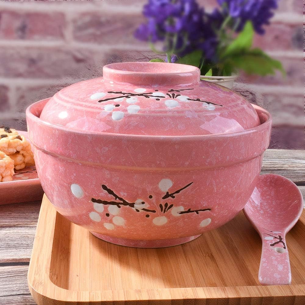 1 big pink bowls with lid, 5 pieces pink spoons. good set for soup and ramen