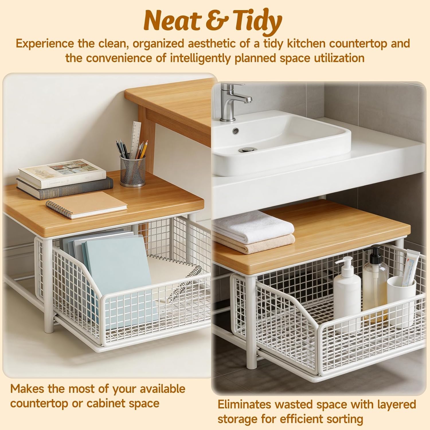 Kitchen Countertop Organizer with Drawer – 2-Tier Hardwood Shelf Q1: What storage features does this organizer include? A1: It features a 2-tier hardwood shelf plus a built-in drawer and wire basket, providing versatile space for spices, utensils, and kitchen essentials. Q2: Is it sturdy enough for small appliances? A2: Yes. Made of sturdy hardwood, it safely holds coffee makers, toasters, and microwaves while maximizing vertical counter space. Q3: How does it help save space? A3: Its compact 2-tier design utilizes vertical space efficiently, keeping appliances and supplies organized without cluttering countertops—perfect for small kitchens and pantries. Feature 1. Space-Saving Vertical Design for Small Kitchens 2. Dual Versatile Storage with Smooth Sliding Access 3. Sturdy Hardwood & Metal Build for Durability 4. Chemical-Free & Eco-Friendly for Healthy Homes 5. Hassle-Free Assembly & Easy Care Specifications: Name:Kitchen Countertop Organizer with Drawers Size: Monolayer(14.56*9.84*6.29in) Double-deck(14.56*9.84*12.99in) Color: White/Black Material: Carbon Steel+Natural Timber Package Contents: 1PC * Kitchen Countertop Organizer with Drawers Note: 1. Due to manual measurement, please allow an error of 1-2cm. 2. Due to the different display and different light, the picture may not show the actual color of the item. Thanks for your understanding.