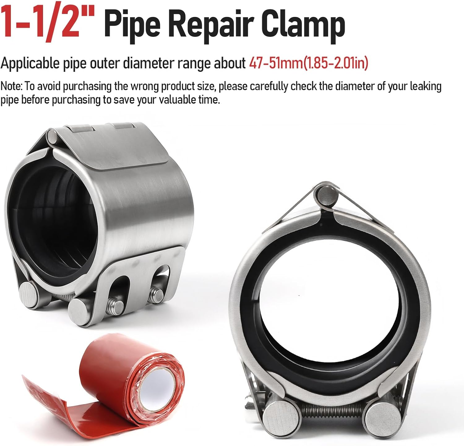 【Enhanced Leak Protection with M1 Self-Adhesive Tape】 Our pipe repair clamp includes a high-performance M1 self-adhesive leak-sealing tape for a airtight, permanent seal. The tape is elastic, non-sticky to touch, but once tightly wrapped, it instantly bonds and fuses into a single unit, becoming impossible to separate (so ensure a successful seal on the first attempt). Combined use of both the clamp and tape, ensuring no leaks even under high pressure (up to 30Bar/435PSI) 【Durable 304 Stainless Steel & Professional Design】 Made of thickened 304 stainless steel with precision spot welding and one-time molding, this clamp resists rust and deformation. The high-quality NBR rubber liner and surface passivation treatment ensure long-lasting performance in temperatures from -4°F ~ +212°F (-20 ℃ ~ +100 ℃). Perfect for emergency repairs on plastic or metal pipes. 【2 Flexible Installation Methods】 Use the clamp alone for quick fixes or combine it with the M1 tape for reinforced sealing. Simply locate the leak, wrap the tape if needed (Tips: Wrap tape around the leak point or on both sides of the leak point (where the clamp will be installed)), align the clamp to the leak, and tighten the screws. required a 6mm hex wrench ONLY(not included)—ideal for both beginners and professionals. 【Versatile & Reusable for Multiple Pipe Types】 Suitable for 1-1/2"(47-51mm) outer diameter pipes, this repair kit works on PVC, copper, PE, iron, and more. It can be reused for future repairs and is compact enough for narrow spaces, making it a must-have for home, industrial, or agricultural use (e.g., sprinkler systems). 【Complete Emergency Pipe Repair Solution】 Each kit includes 1 stainless steel pipe repair clamp and 1 roll of 39in / 100cm M1 self-adhesive tape. Whether dealing with pinhole leaks, bursts, or punctures, this combo offers a reliable, quick fix for water, gas, or oil lines, saving time and costly replacements.