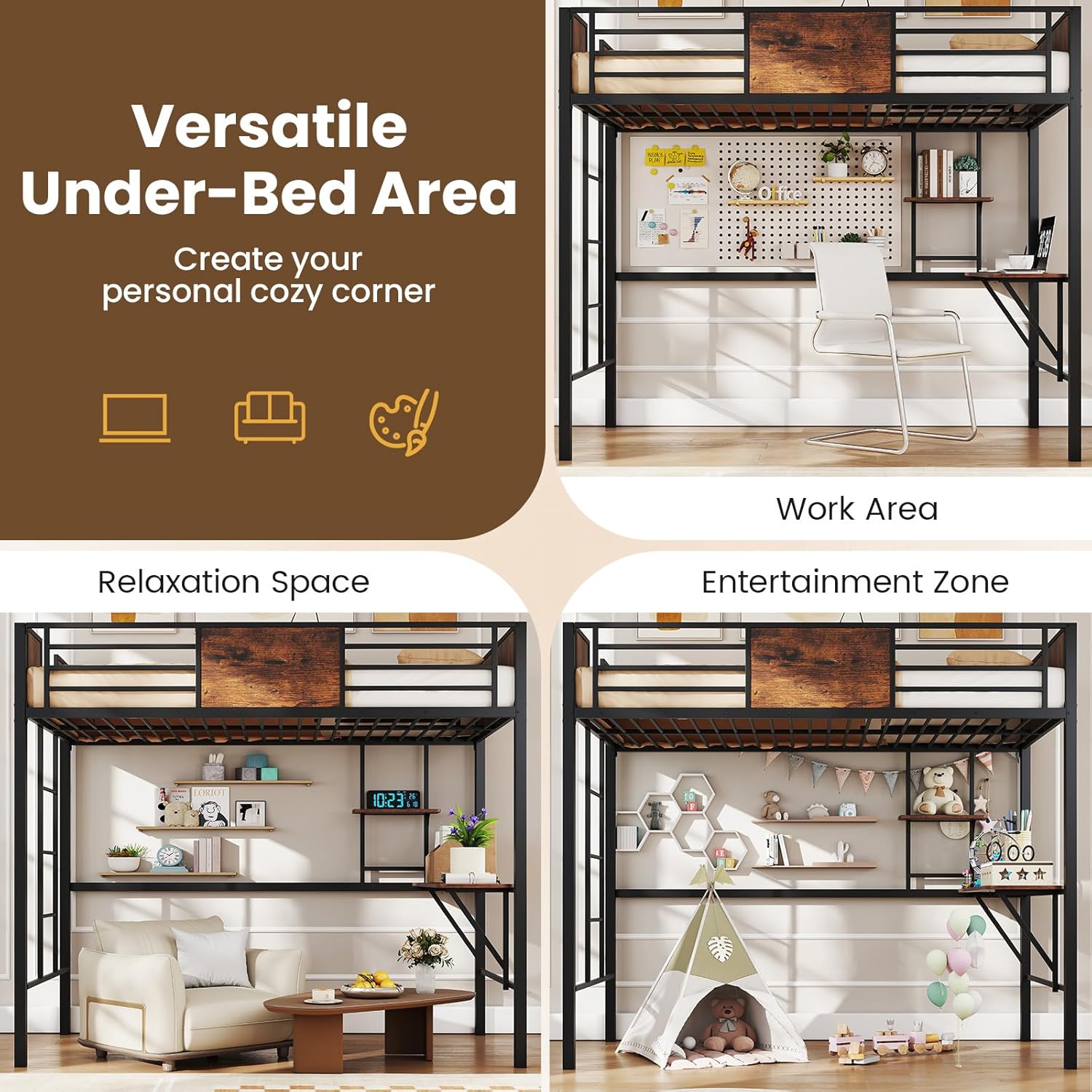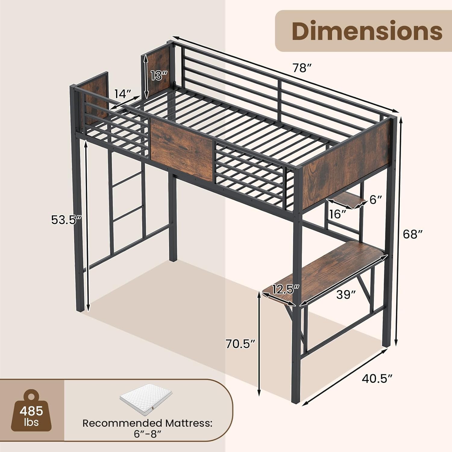 Description:Experience ultimate functionality with the twin loft bed with desk designed to maximize productivity and space.The twin loft bed not only offers a comfortable elevated sleeping area but also includes a spacious 39" x 12.5" built-in desk and additional shelving for your storage and work needs. The heavy-duty metal frame includes 23 powder-coated metal slats and a reinforced middle bar, ensuring exceptional sturdiness and durability with support up to 485 lbs. Equipped with safety features like a full-length guardrail, a 3-step ladder, and anti-tipping devices, the bed ensures durability and peace of mind. The thoughtful design, including a triangular support structure and smooth round edges, prioritizes safety and structural integrity. Transform your under-bed area into a versatile nook for work, relaxation, and entertainment, and create your personal cozy corner.Features:Spacious built-in desk provide more space to work and storageIntegrated shelf enhances organization with ample storage spaceSturdy metal frame construction ensures sturdiness with powder-coated slatsMetal frame construction ensures sturdiness with powder-coated slatsFeatures a strong weight capacity, supporting up to 485 lbsSafety guardrail prevents accidental falls and provide essential protection3-step ladder ensures safe and easy access to bedFeatures 2 anti-tipping devices for enhanced safetyTriangular supports strengthen structure providing enhanced stabilitySmooth round edges on shelves for added safetyUnder-bed area can be used as relaxation space, entertainment zone, or work areaAssembly neededSpecification:Color: Black + Rustic BrownMaterial: Metal, Engineered WoodOverall Dimensions: 78" x 40.5" x 68" (L x W x H)Dimensions of Bed Surface: 75" x 39" (L x W)Recommended Mattress: 6"-8" TwinGuardrail Height: 13"Ladder Width: 14"Under-Bed Space Height: 53.5"Dimensions of Desk: 39" x 12.5" x 28" (L x W x H)Dimensions of Shelf: 16" x 6" (L x W)Weight Capacity of Bed: 485 lbsWeight Capacity of Desk: 45 lbsWeight Capacity of Shelf: 22 lbsWeight Capacity of Ladder: 440 lbs/200 kgNet Weight: 94 lbsPackage Includes:1 x Loft Bed with Desk1 x User Manual