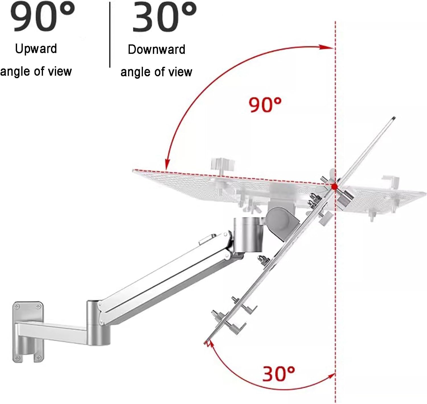Specifications: The product is a wall-mounted laptop mount made from durable aluminum alloy. It features a constant force bearing capacity of 3-6 kg, ensuring reliable support for your devices. The elegant silver color blends seamlessly with any decor. It offers versatile rotation angles, allowing left and right as well as front and back pitch adjustments for optimal viewing. The lift capacity reaches 450mm, accommodating a variety of heights. The tray size measures 40*30mm, providing a stable platform for your laptop. The unfolded arm length extends to 610mm, enhancing accessibility and convenience. Included with the product is one laptop wall mount.