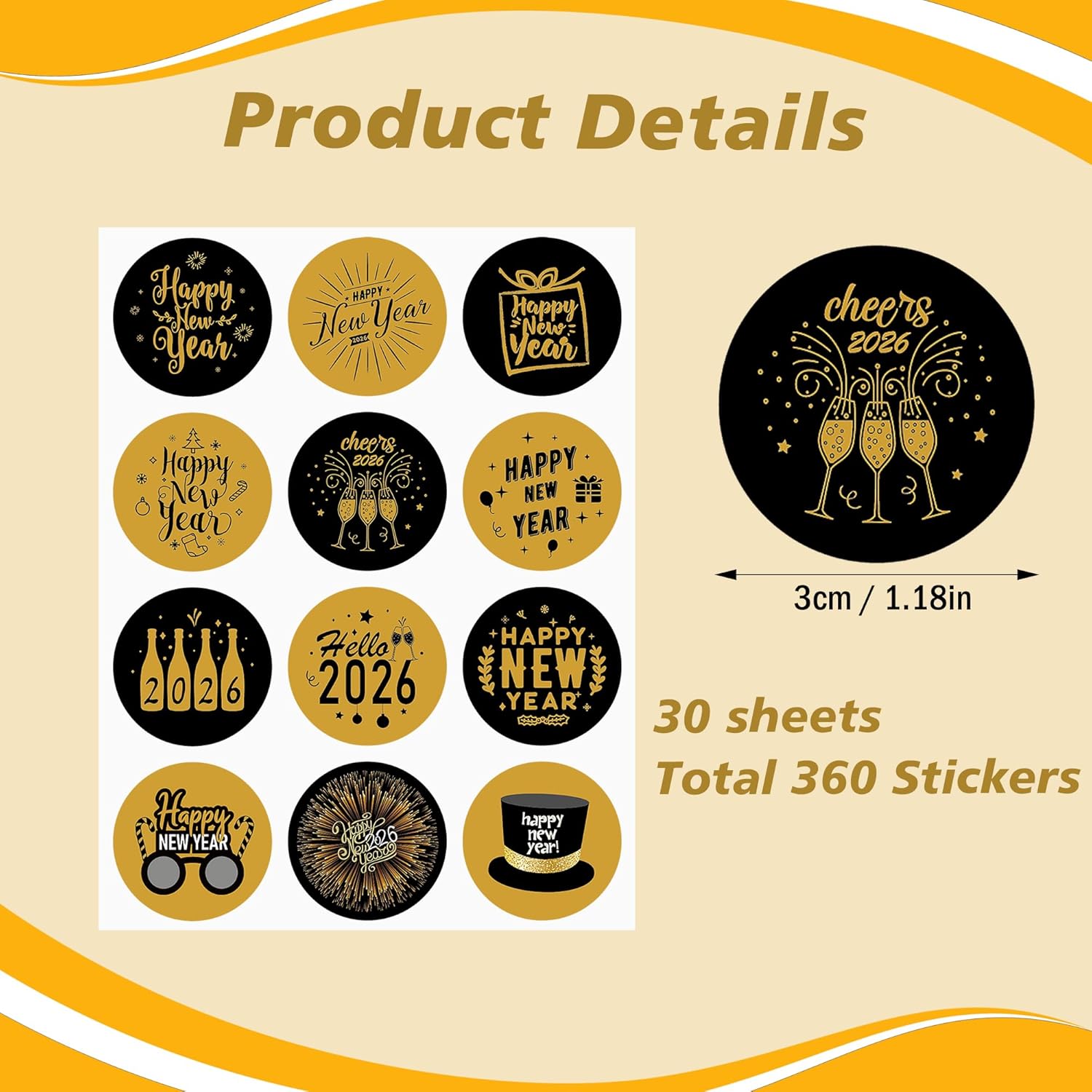 Specifications: Type: Happy New Year Stickers for Kids Envelopes Seals 2026 Diameter: 1.18 inch (3CM) Color: Black and Gold Material: Paper Quantity: 360PCS Features: 360PCS black and gold happy 2026 new year stickers, 12 different styles, the quantity will meet your various demands. Easy to use, no glue need. Easy to stick and peel off on most surfaces, removed without residue. Suitable size for candy bags, goodies, gift boxes, greeting cards and envelope seals, crafts stickers for kids, new year party sticker. Great new year gifts for kids. Package Includes: 30 Sheets total 360 PCS Happy New Year Stickers 100% Satisfaction: Our service objective is your 100% satisfaction, if you have any questions, please contact us and we will give you a satisfactory reply.