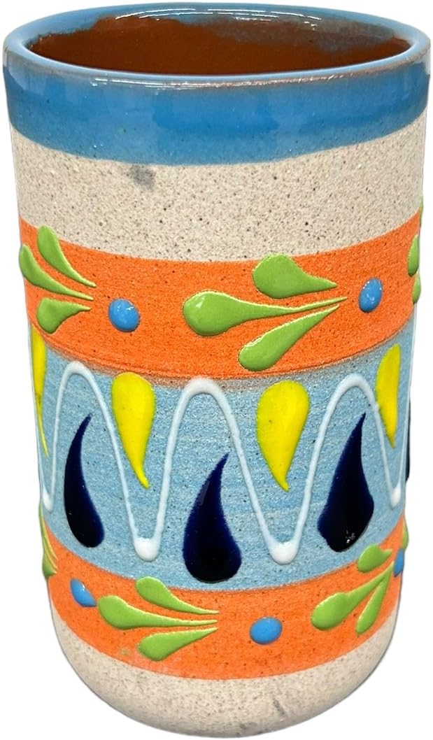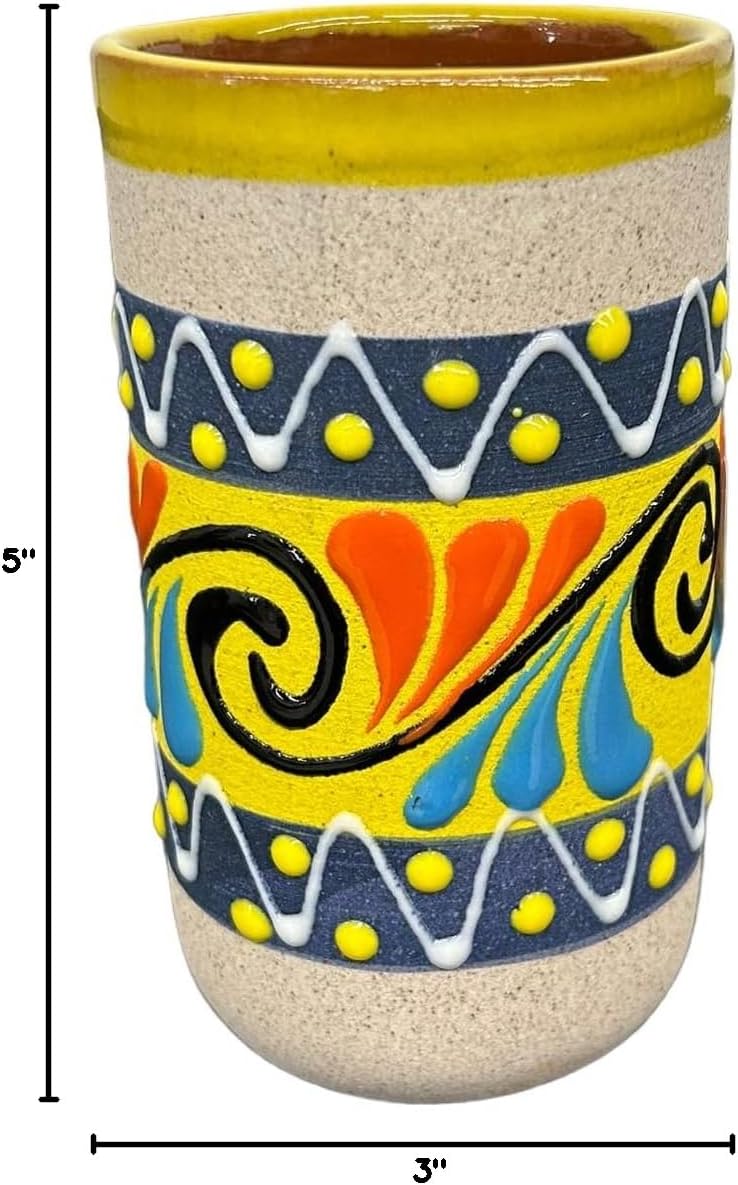 Hand crafted and painted in Mexico, each cup is uniquely crafted out of natural clay by hard working artisans in Mexico. Several assorted colors, you will recieve a set of 4 individualy designed and colored cups. Glazed Inside, creating a food safe product, and elimanating the need to cure each cup. Large Size, 7 inches tall and 3 inches diameter. Perfect for consistent use, perfect for tequila, vodka micheladas, tepache, ponche, mezcal, avena, atole, cafe, tea, choclate, party decorations, kitchen, housewarming gift, and 5 De Mayo!