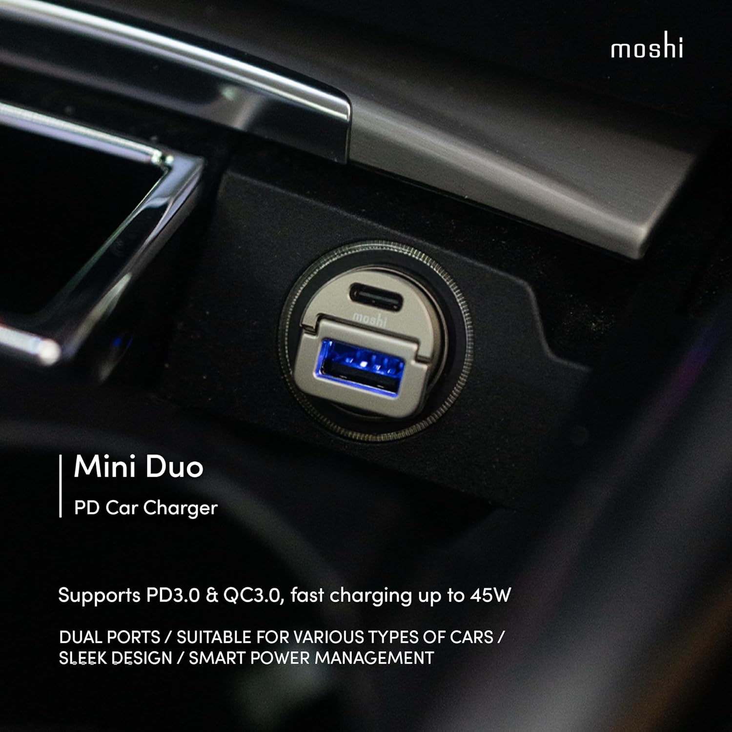 Supports PD3.0 & QC3.0, fast charging up to 45W. DUAL PORTS / SUITABLE FOR VARIOUS TYPES OF CARS / SLEEK DESIGN / SMART POWER MANAGEMENT