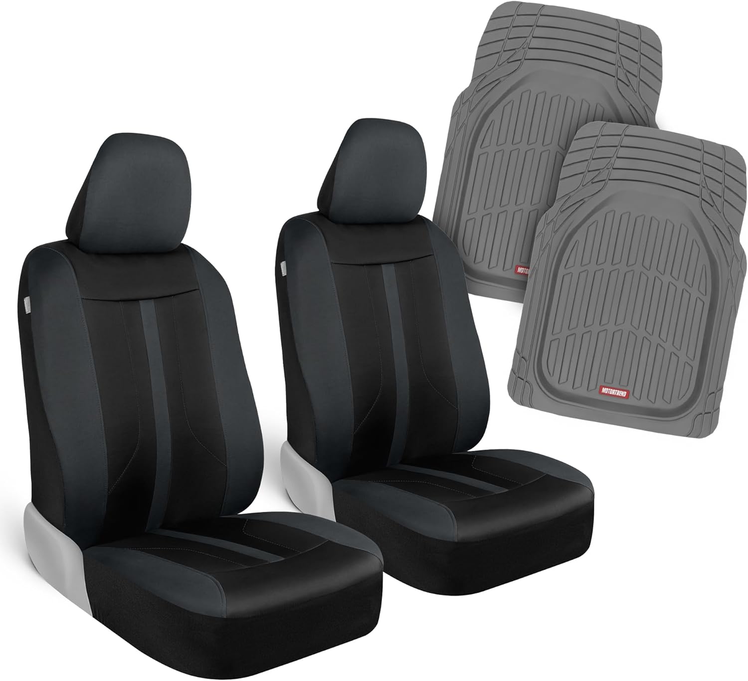 Complete Front & Rear Interior Protection Upgrade and protect your vehicle’s interior with the Motor Trend Front & Rear Seat Cover Full Set. This combo includes 2 gray cloth front bucket seat covers and 1 AquaShield waterproof rear split bench cover, giving you balanced comfort and durable protection for everyday driving. Breathable Cloth Front Seat Covers The front seat covers are made from premium woven cloth designed to protect against dirt, stains, fading, and daily wear while maintaining driving comfort. The soft, breathable material refreshes your interior without trapping heat. Please note: the front seat covers are cloth and are not waterproof. Waterproof Rear Seat Protection The rear seat cover features AquaShield waterproof neoprene lining that helps guard against spills and stains from baby bottles, juice boxes, sports equipment, muddy gear, groceries, and pets. Ideal for families and active lifestyles, the rear cover helps keep your original upholstery clean and protected. Universal Fit for Most Cars, SUVs & Trucks Designed to fit most vehicles with removable headrests and split rear benches (50/50, 60/40, 40/60 configurations). Compatible with many popular models including: Toyota: Corolla, Camry, RAV4, Tacoma Honda: Civic, Accord, CR-V, HR-V Ford: Focus, Fusion, Escape, F-150, Ranger Chevrolet: Malibu, Equinox, Silverado Nissan: Sentra, Altima, Rogue, Frontier Hyundai: Elantra, Sonata, Tucson, Santa Fe Kia: Forte, Soul, Sportage, Sorento Jeep: Wrangler, Grand Cherokee, Compass Subaru: Impreza, Outback, Forester GMC: Sierra, Canyon This front and rear seat cover combo is ideal for commuters, families, pet owners, and work vehicles looking to maintain a clean, refreshed interior while helping protect long-term resale value.