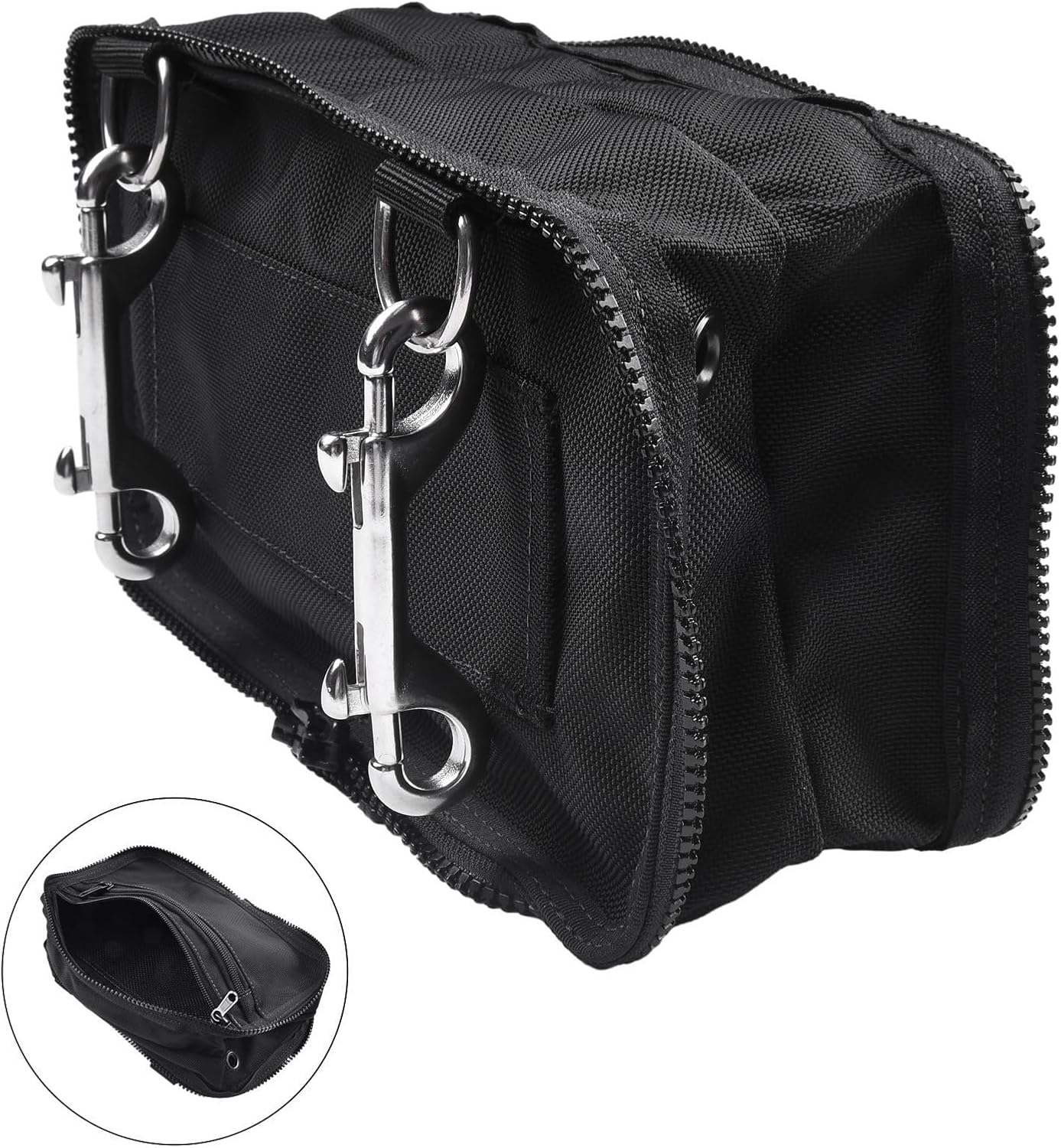 Product description Features:**Made of - materials,*Made in strong nylon for long lasting use.*Perfect size bag for your diving accessories*The closure is with zippers that ensures a perfect seal.*Two D-rings are attached inside the pouch, and double ended snap hook are attached outside to pouch.Specifications:*Material: Nylon *Color: Blabk(as shown in the picture)*Size:25*15*8cm(as shown in the picture)(approximately)*Quantity: 1pc Package Contents:1*Diving Sidemount Pouch Bag Manufacturer Contact Information no