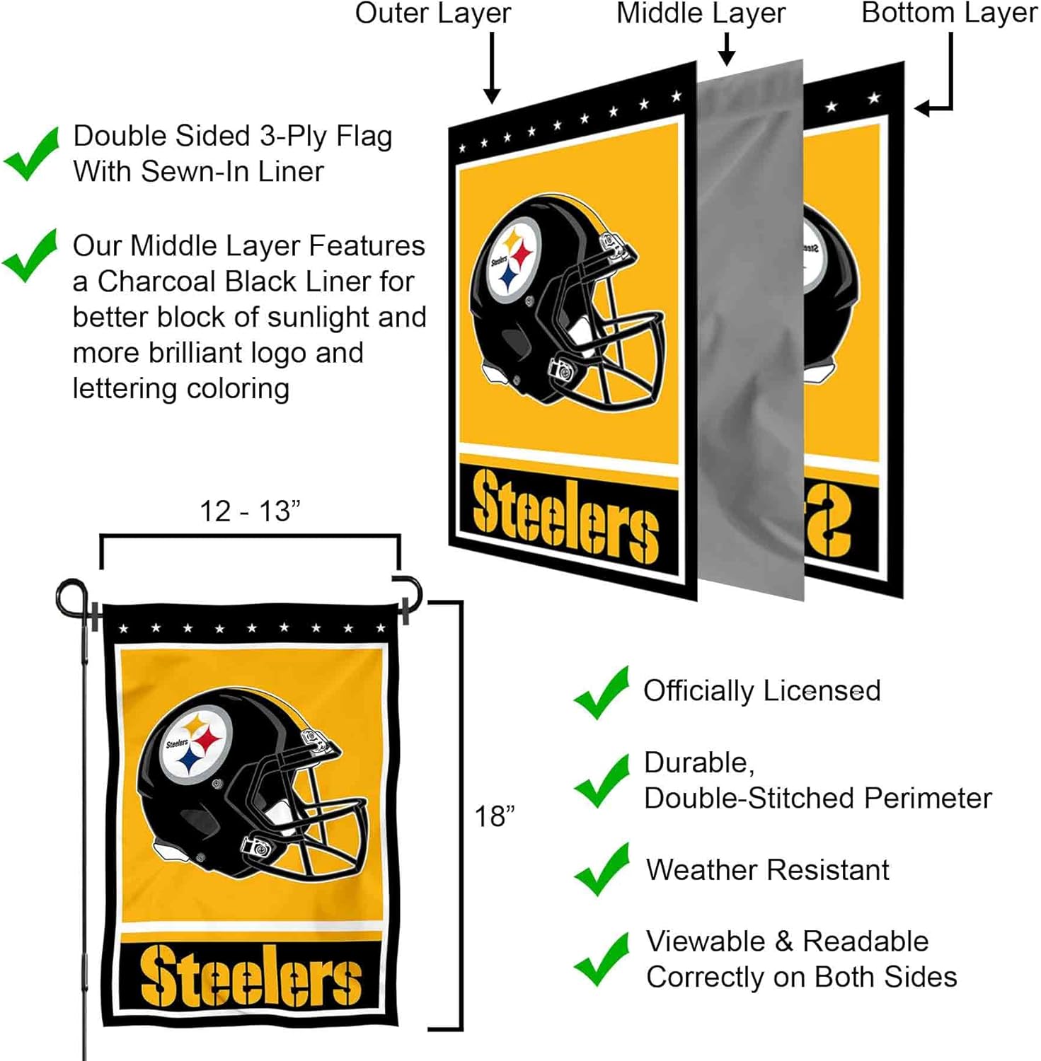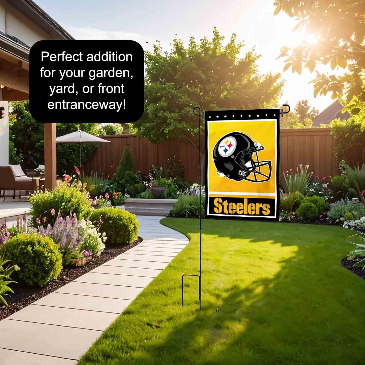This Flag, Banner or Pennant is a perfect set for your yard or home entrance. It includes your selected 13 in x 18 in Double Sided Pittsburgh Steelers Garden Flag along with a Sturdy Steel Powder Coated Garden Flag Stand with 2 included Rubber Stoppers. The garden flag measures 13 in x 18 in, is made of 2-ply Polyester with Sewn-In Liner, is Screen Printed, has a top pole sleeve for inserting the included Garden Flag Stand, and the logos are Viewable and Readable Correctly on Both Sides. The Garden Flag Stand measures an assembled height of 40" and has a flag crossbar width of a large 17". Also, the stand is made of steel, is powder coated black for rust resistance, and the ground stake is made with double welds for extra durability. A unique gift, our Flag, Banner or Pennant is ready to fly and no tools are needed for assembly. The Flag is Officially Licensed and Team Approved.